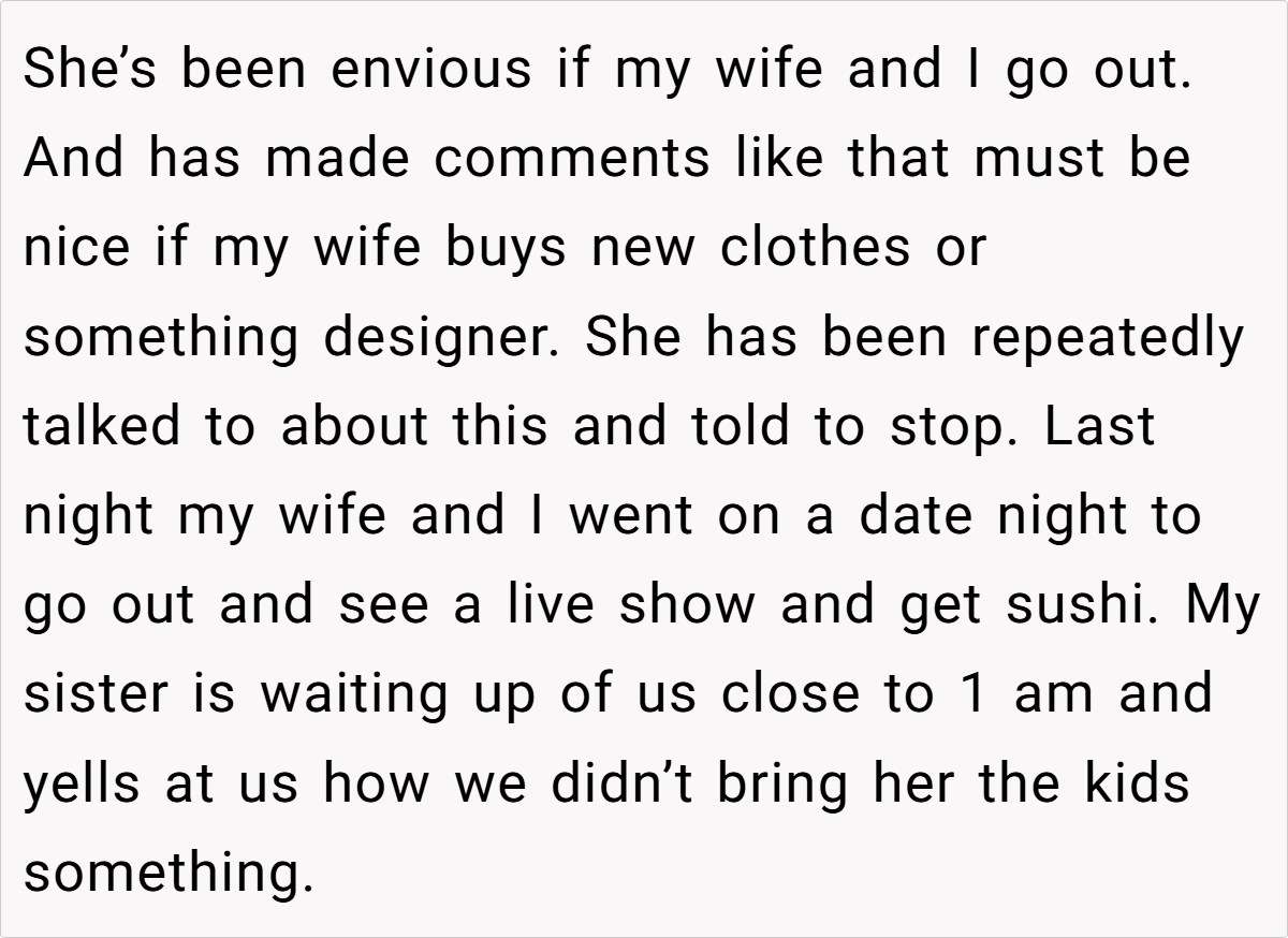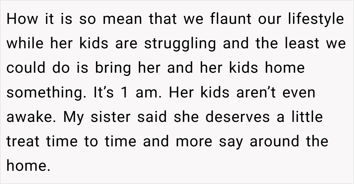 Beyond the immediate conflict, this story also touches on broader social issues, such as the challenges of dealing with entitlement and the pressure to balance familial loyalty with self-care. While the sister’s circumstances may have initially called for compassion, her repeated disregard for household norms has forced the OP’s family to take a stand.