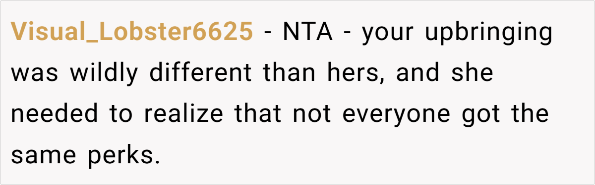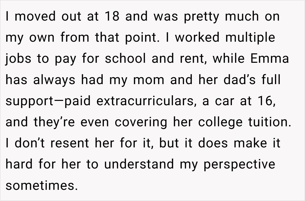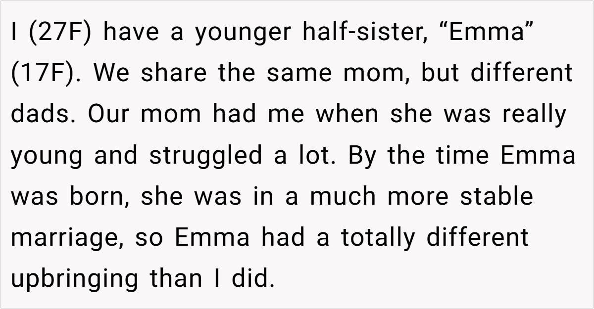 Family dynamics can be tricky, especially when siblings grow up in completely different circumstances. OP (27F) and her younger half-sister, Emma (17F), share the same mother but have very different upbringings. While OP had to become independent at 18 with little financial support, Emma grew up in a stable, well-supported household, receiving financial help, a car, and even fully covered college tuition.