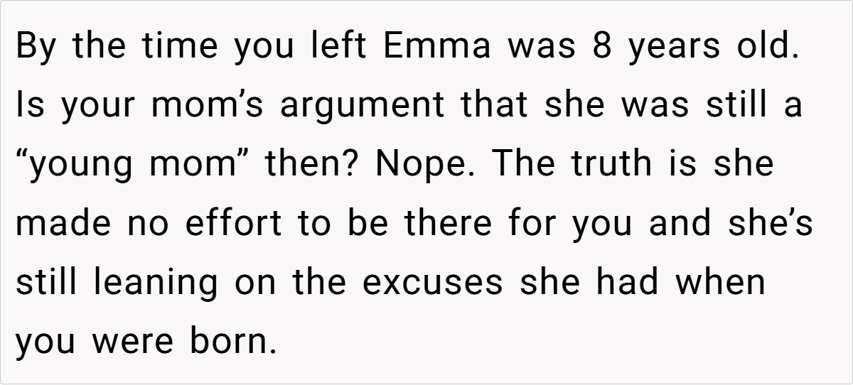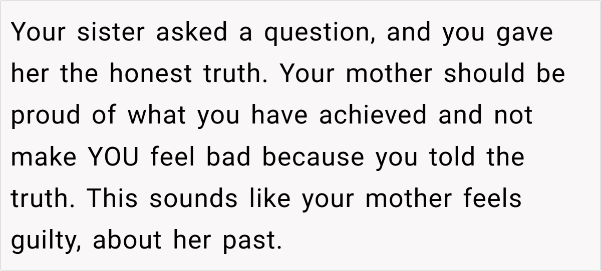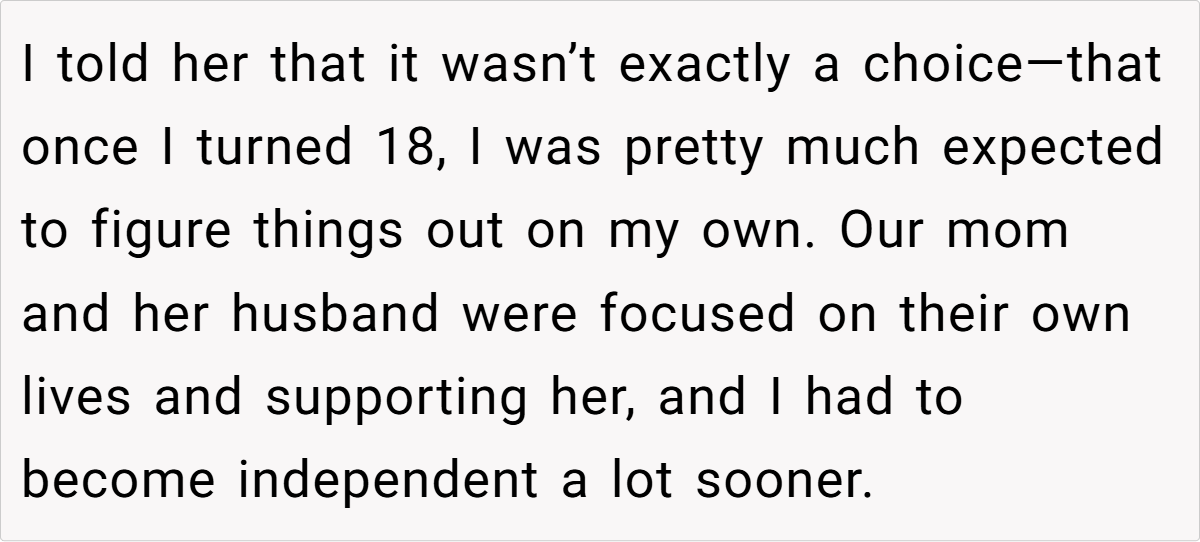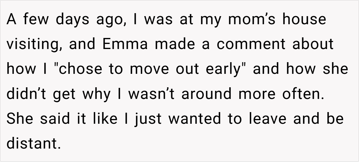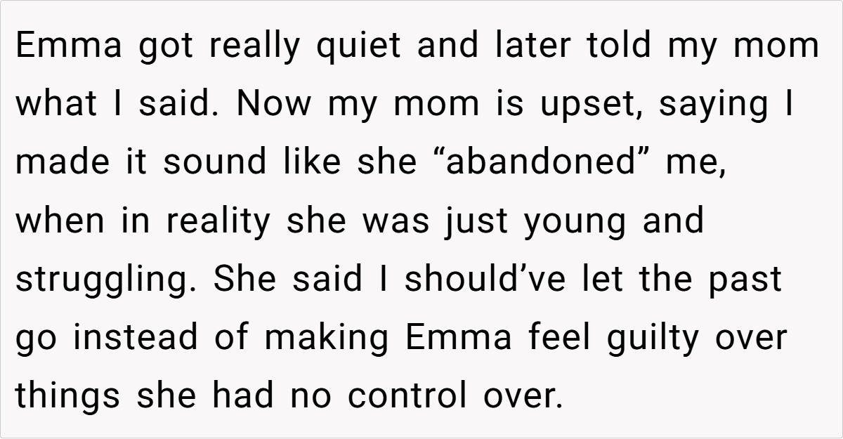 When Emma asked why OP wasn’t around as much, OP gave her an honest answer—that once she turned 18, she had to figure life out on her own while their mom and stepfather focused on Emma. Emma was shocked by this revelation and told their mom, who is now furious at OP for making Emma “feel guilty.” Now OP is wondering: Was she wrong for telling the truth? Or is her mom just avoiding accountability?
