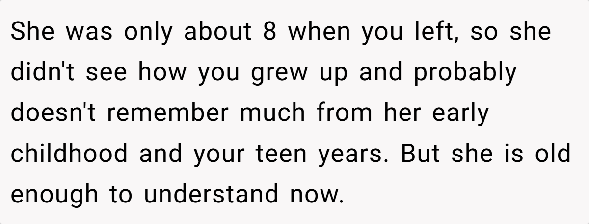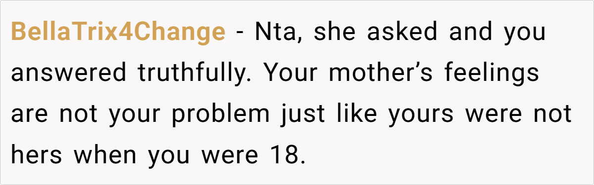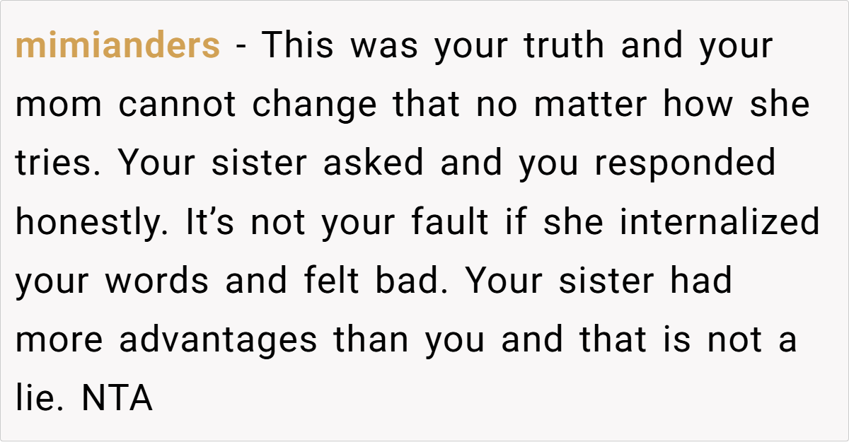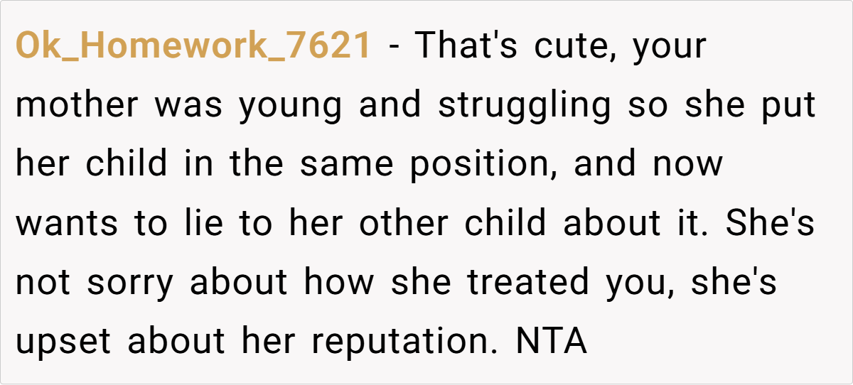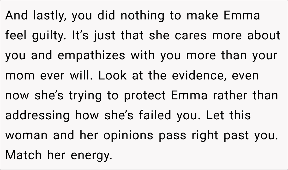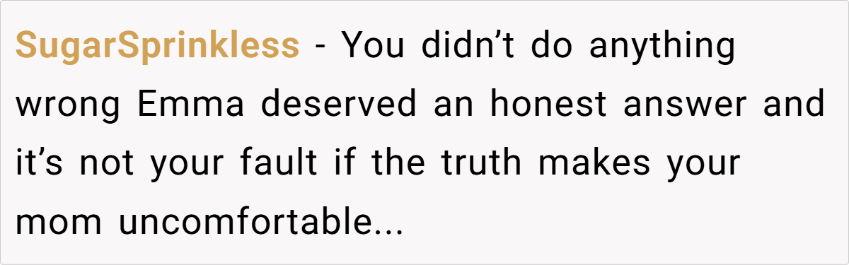 When Emma asked why OP wasn’t around as much, OP gave her an honest answer—that once she turned 18, she had to figure life out on her own while their mom and stepfather focused on Emma. Emma was shocked by this revelation and told their mom, who is now furious at OP for making Emma “feel guilty.” Now OP is wondering: Was she wrong for telling the truth? Or is her mom just avoiding accountability?