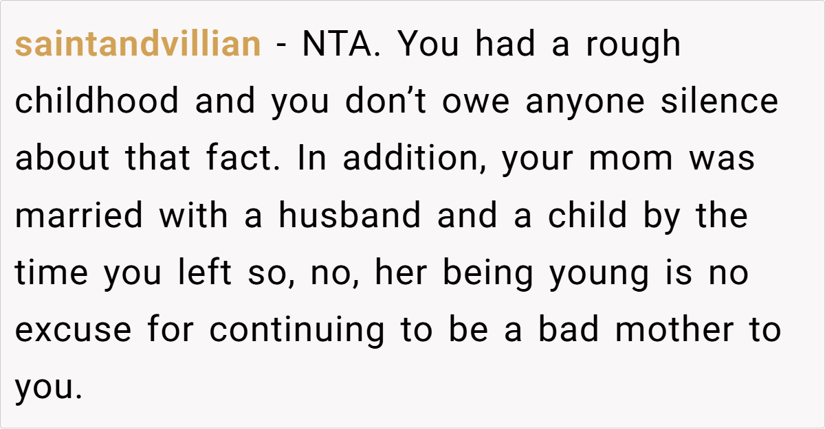 OP’s mother wants her to “let go” of the past, but true healing requires acknowledgment. Ignoring past struggles and expecting OP to stay silent only deepens the emotional divide.