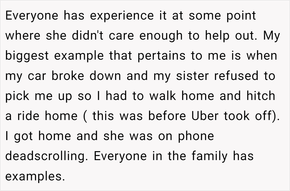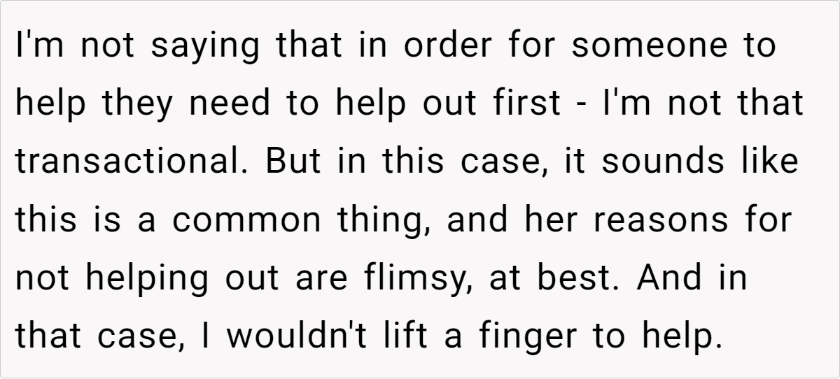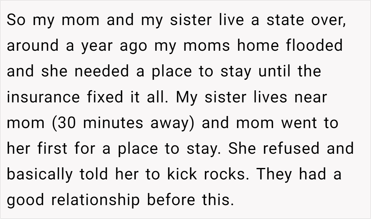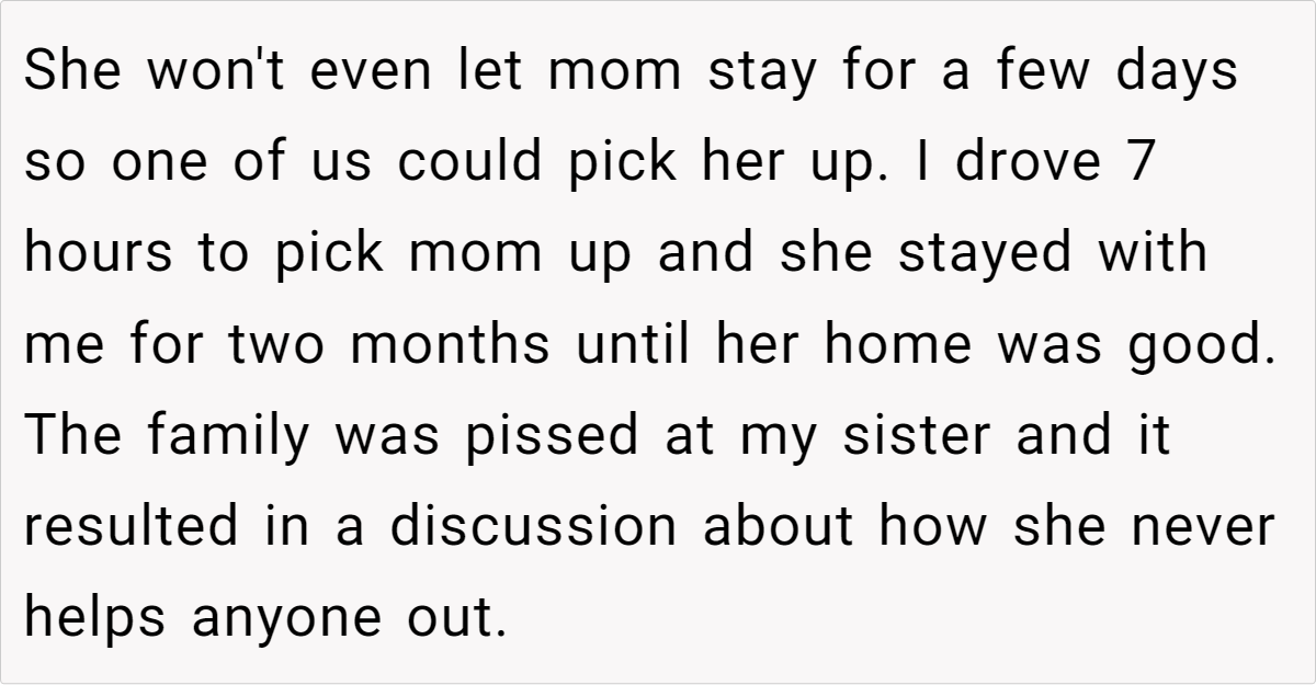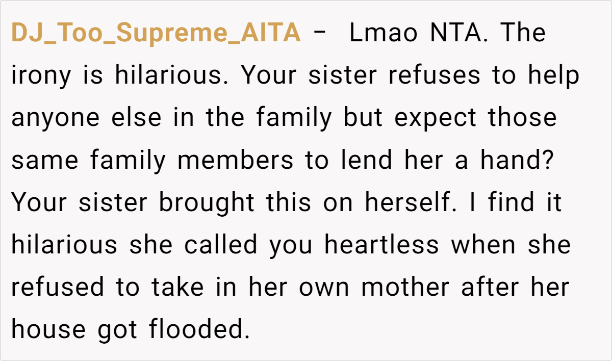 For one sibling, the repeated failure to lend a hand to their mother during crises—ranging from a flooded home to missed rides—has built up over time. When the sister now asks for help as she transitions to a new city, the refusal feels like a long overdue lesson in accountability. This isn’t about pettiness; it’s about the fairness of expecting support when support has rarely been given.