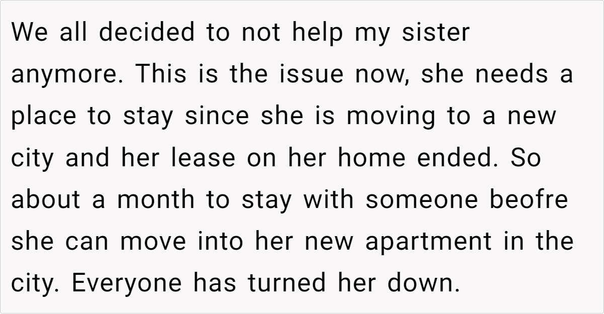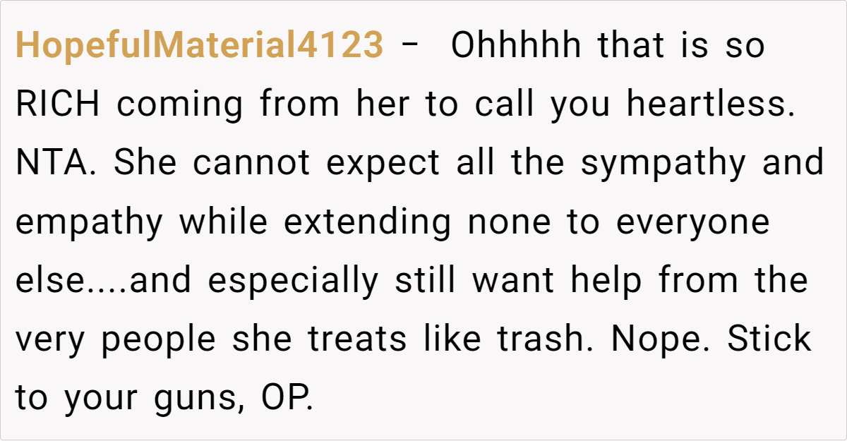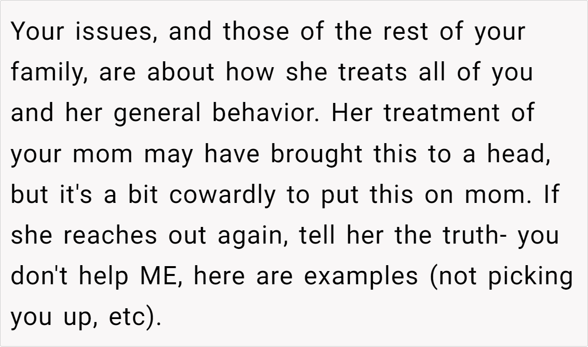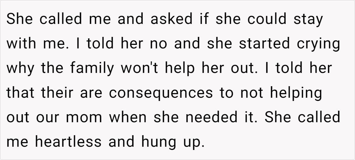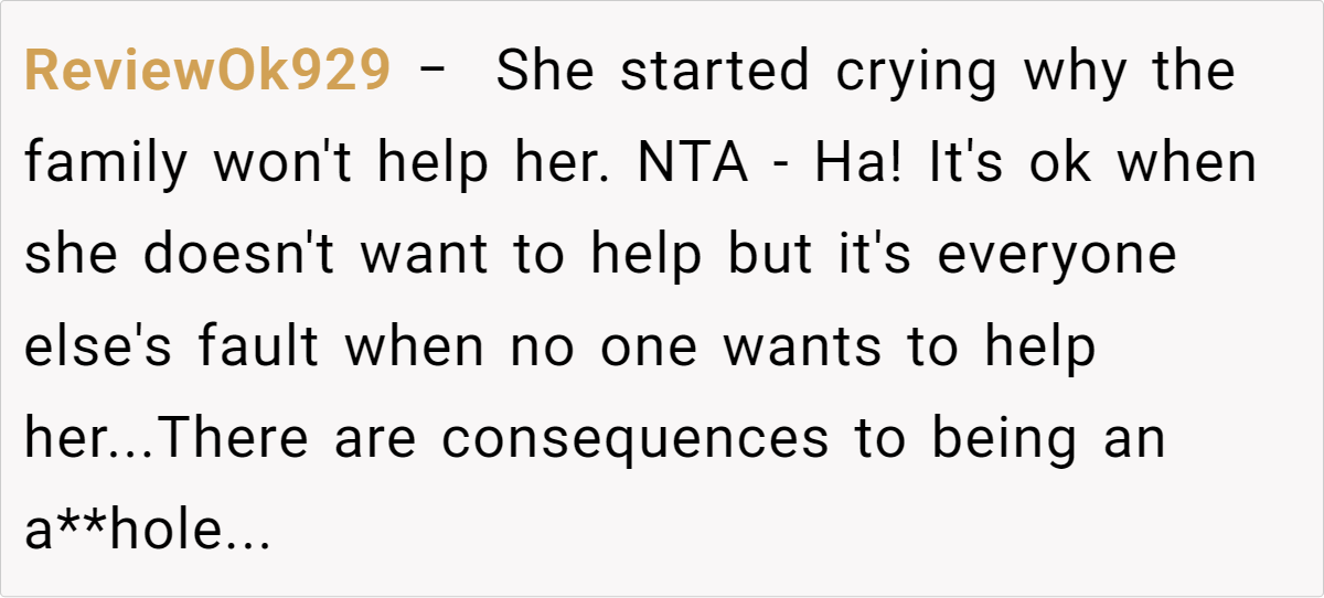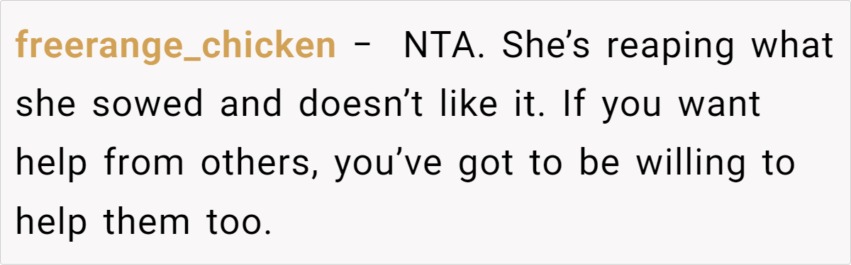 For one sibling, the repeated failure to lend a hand to their mother during crises—ranging from a flooded home to missed rides—has built up over time. When the sister now asks for help as she transitions to a new city, the refusal feels like a long overdue lesson in accountability. This isn’t about pettiness; it’s about the fairness of expecting support when support has rarely been given.