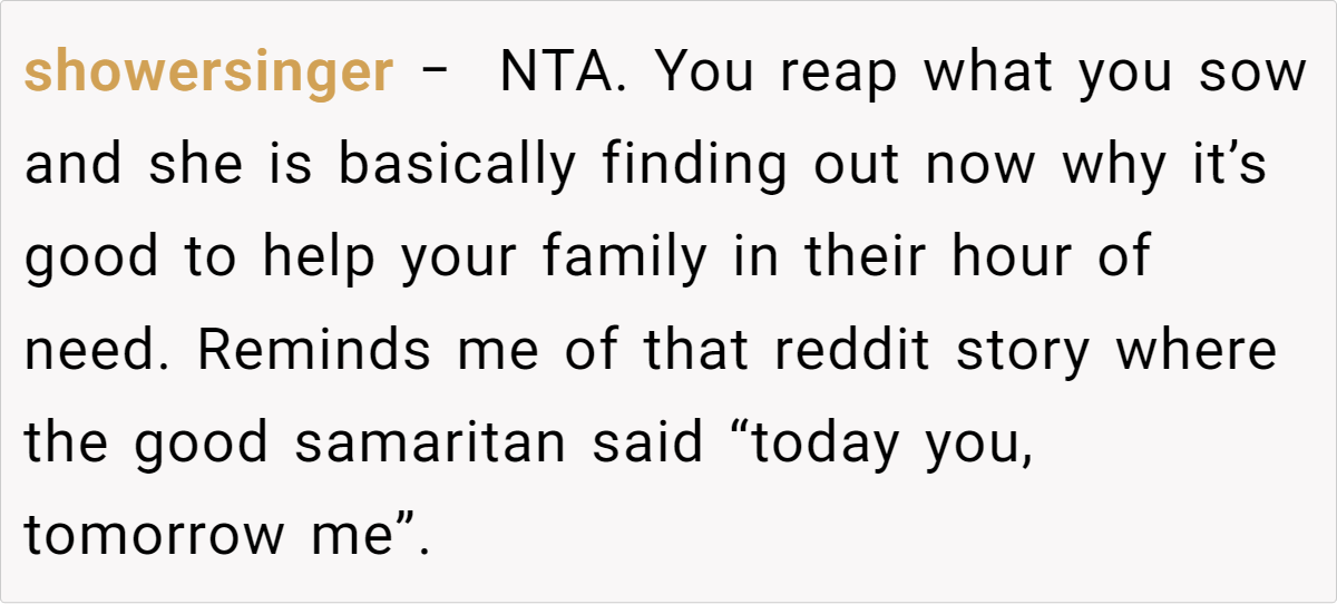 When one party fails to meet this basic standard, it undermines the whole structure of support. In our case, the sister’s long history of not showing up when needed makes the current situation less about personal rejection and more about the natural outcome of past choices.