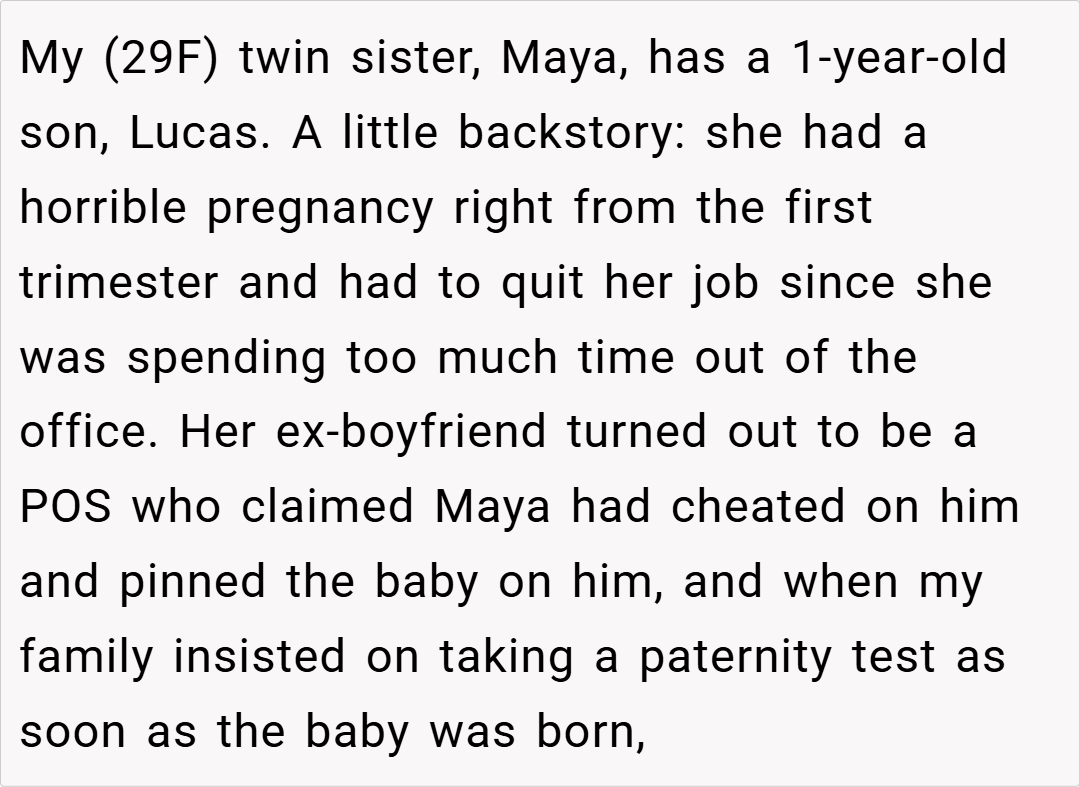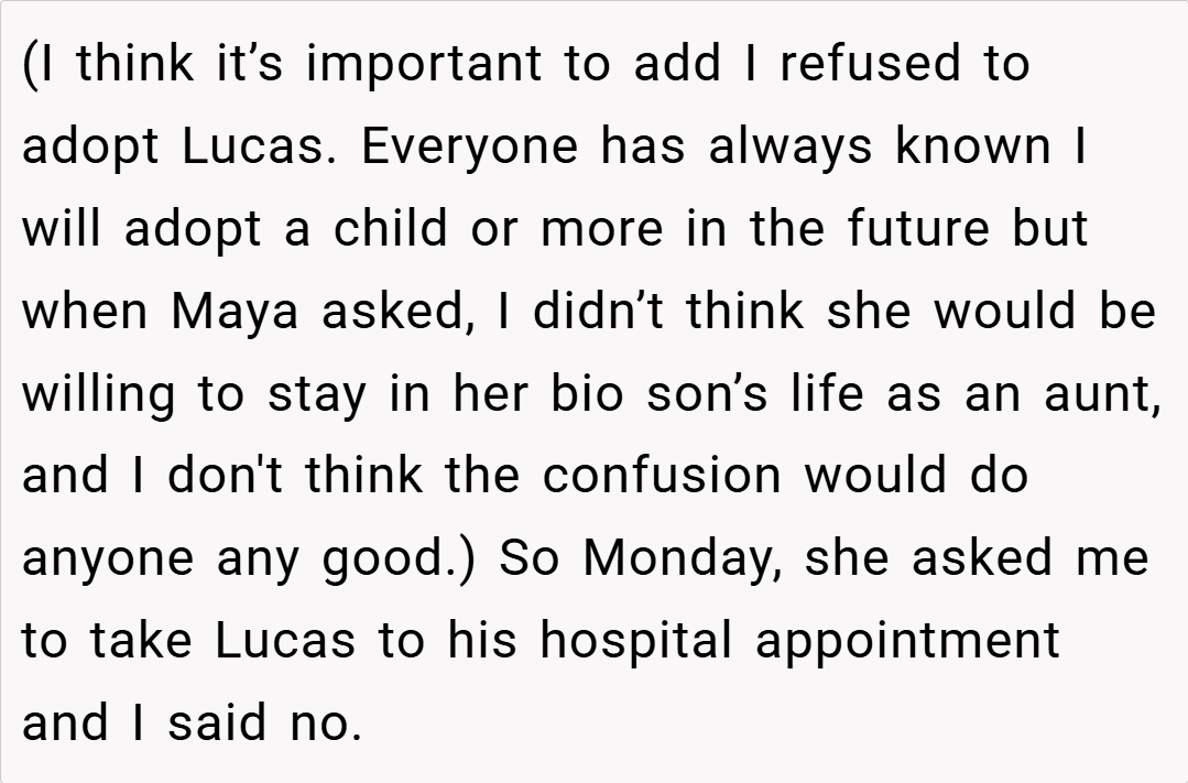 In a shared household with her twin sister, who is struggling with the challenges of being a new mom, a 29-year-old woman has been exceptionally generous—handling night feedings, covering baby expenses, and managing childcare. However, as her sister’s situation began to stabilize, expectations grew. When asked to take her nephew, Lucas, to a hospital appointment, the narrator firmly stated,
