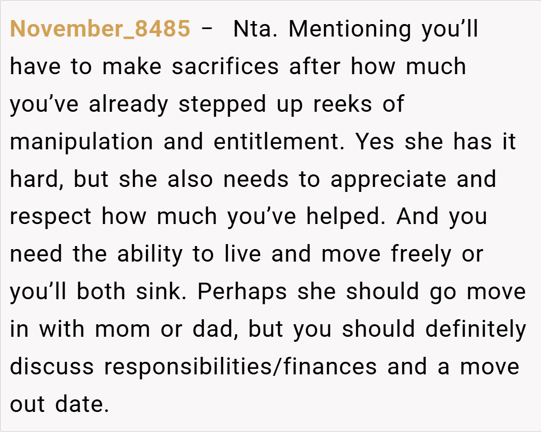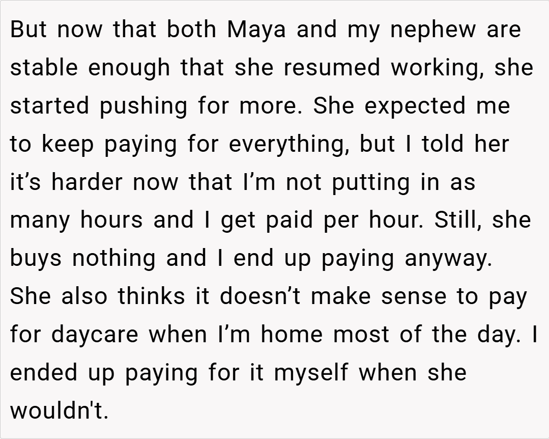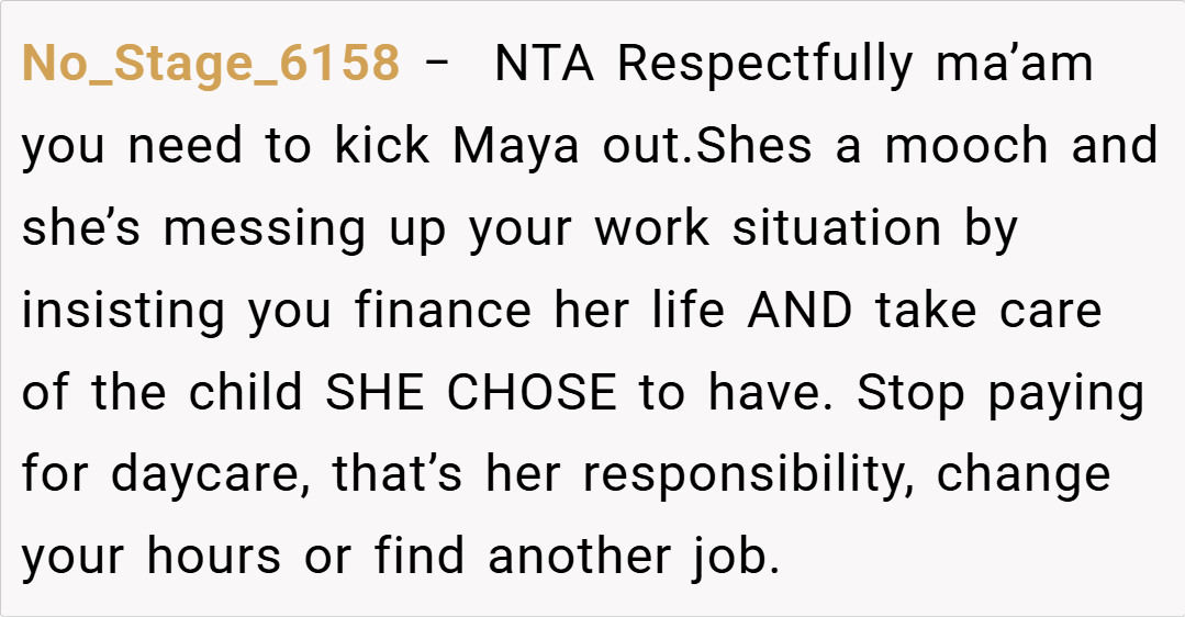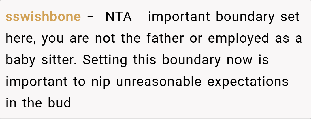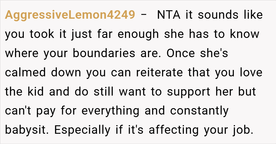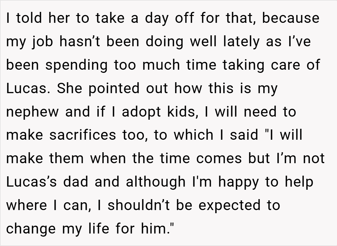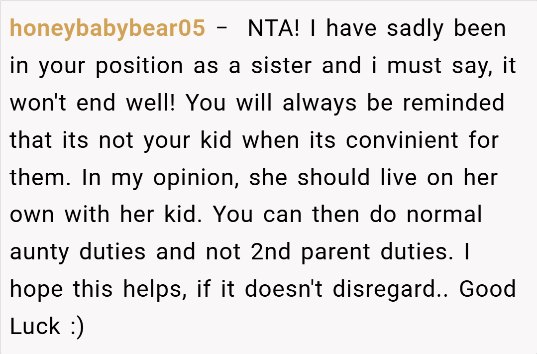 A third user noted, “I get that family means helping out, but when you’re asked to basically become a parent for someone else’s child, it’s a clear sign to re-evaluate the situation.” Finally, another popular comment summed it up: “If you keep letting this happen, you’ll eventually be left with nothing but resentment—and no time for yourself.”