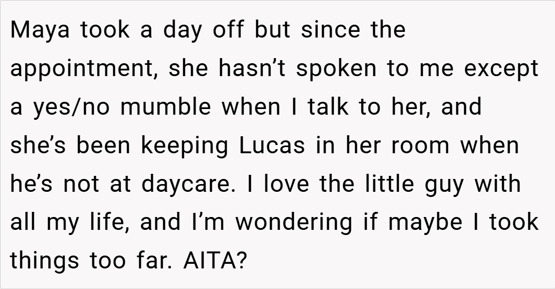 “I’m not Lucas’s dad,” highlighting that she shouldn’t have to change her life to meet these extra demands. This decisive boundary-setting has sparked a heated family dispute, raising questions about where to draw the line between supportive family obligations and preserving one’s own well-being.