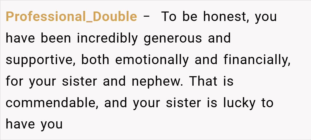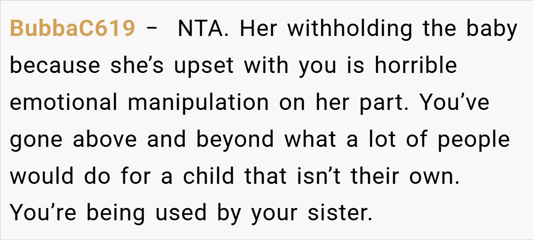 Here are some hot takes from the Reddit community—candid and humorous. One redditor remarked, “Your sister is taking advantage of you; it’s time to reclaim your own life before you’re buried under endless baby bills!” Another commented, “Setting boundaries is essential. You’re not her personal babysitter or financial ATM.