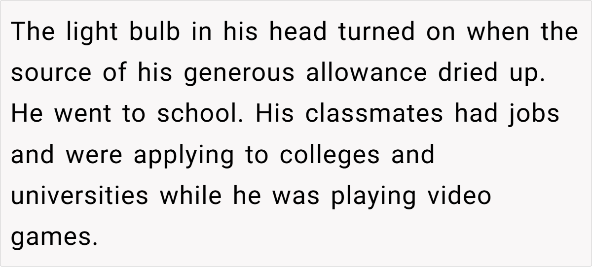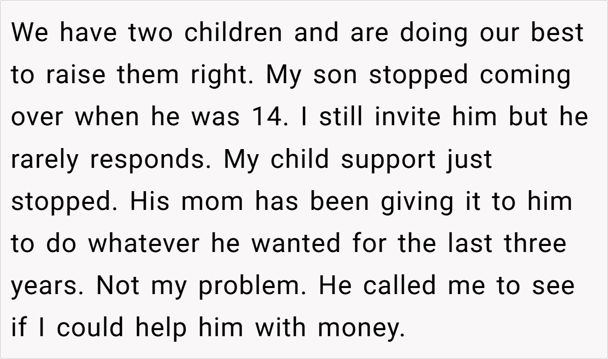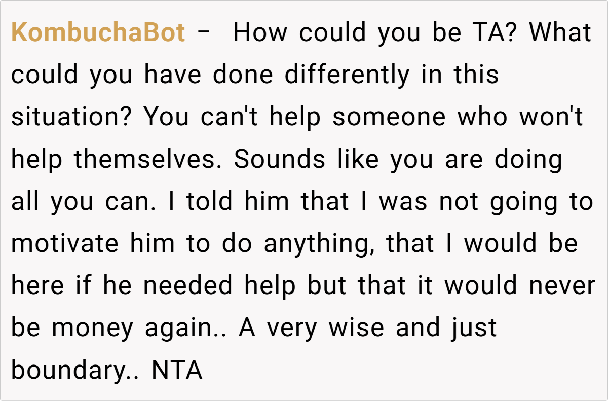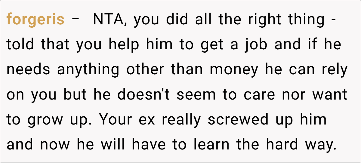 Many redditors agreed that the OP’s decision to stop financially supporting his son is a long-overdue measure. Some commented, “If you’re always rescued, you never learn to fly on your own.” Others pointed out that accountability is essential, even if it means tough love.