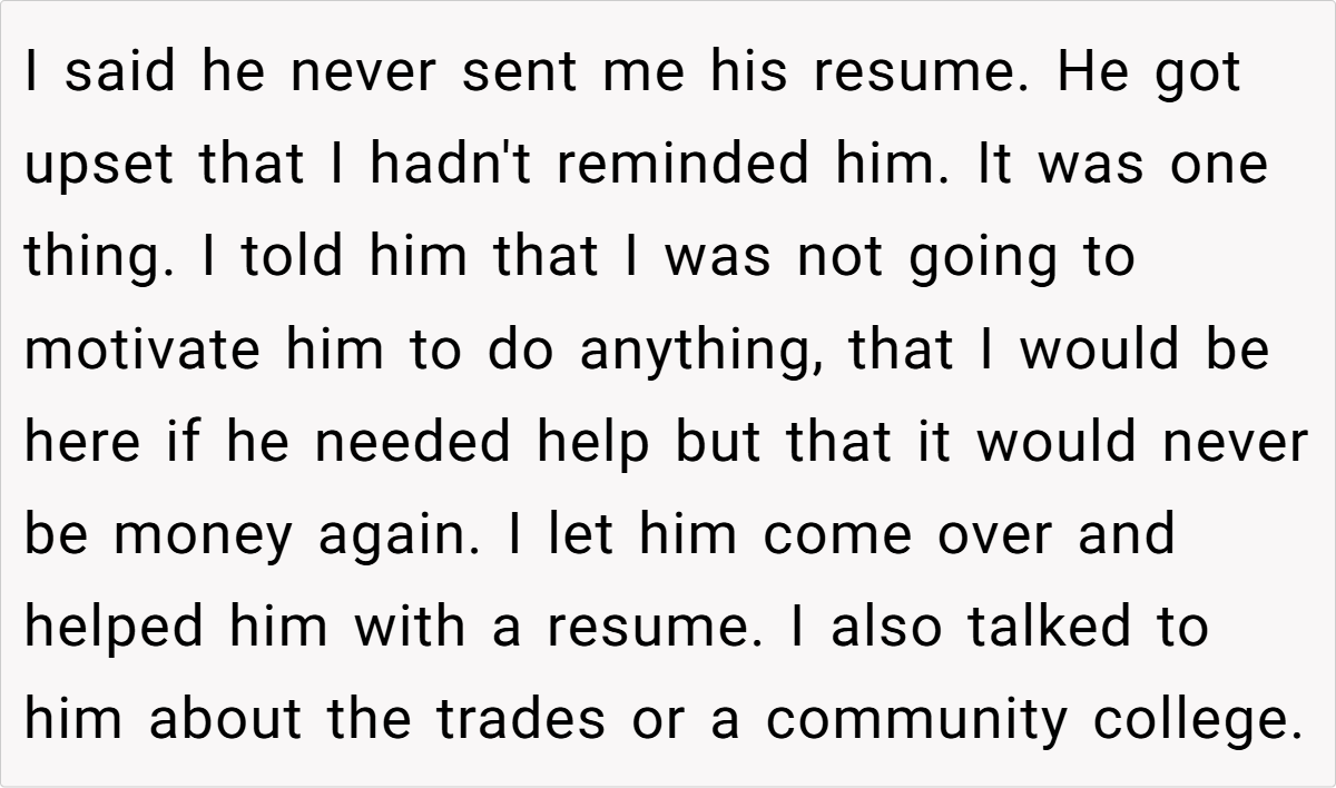 In this situation, the OP’s decision to withdraw financial support is a hard but necessary step toward helping his son learn accountability. By refusing to motivate or support him financially, he’s attempting to break a cycle of overprotection that has long delayed his son’s ability to manage adult responsibilities.