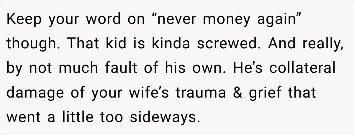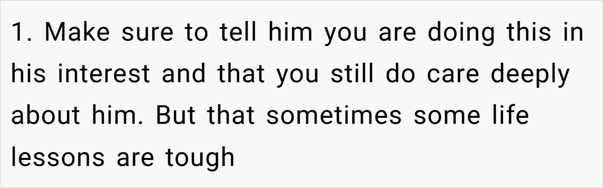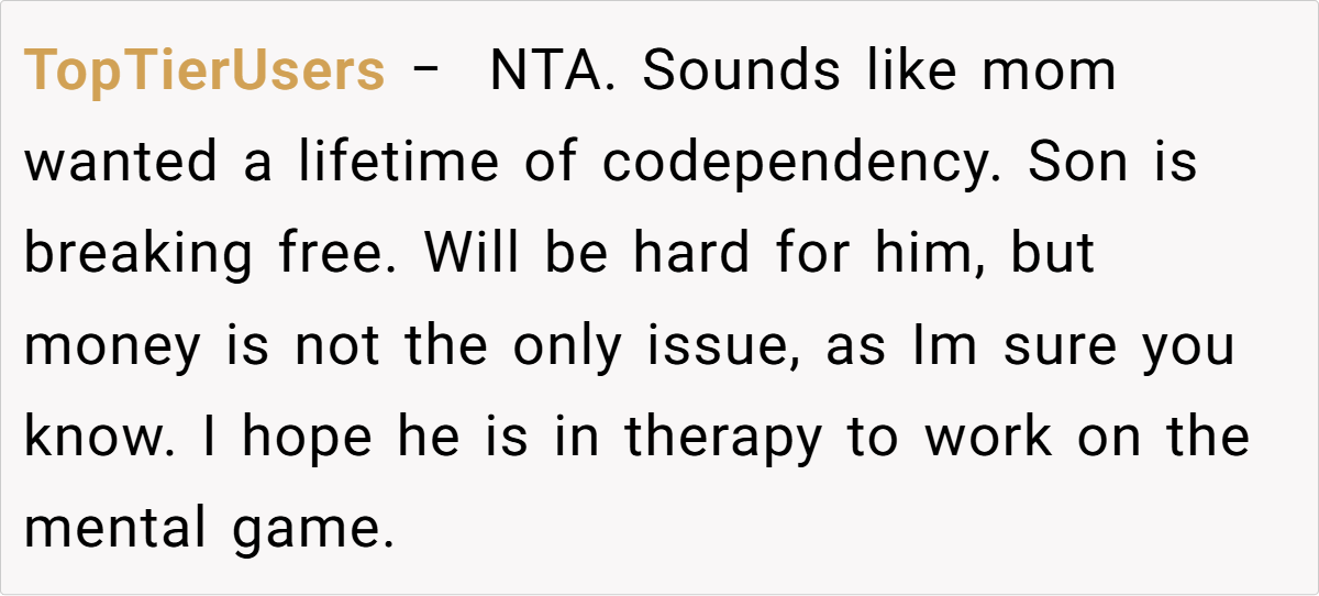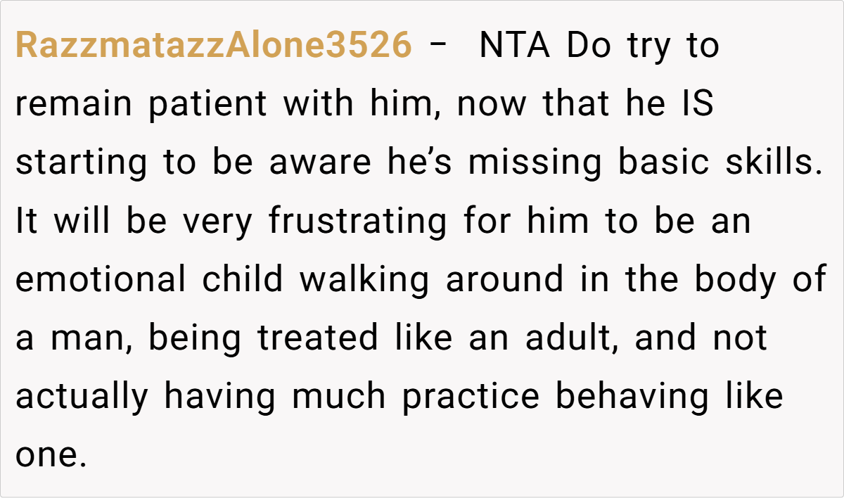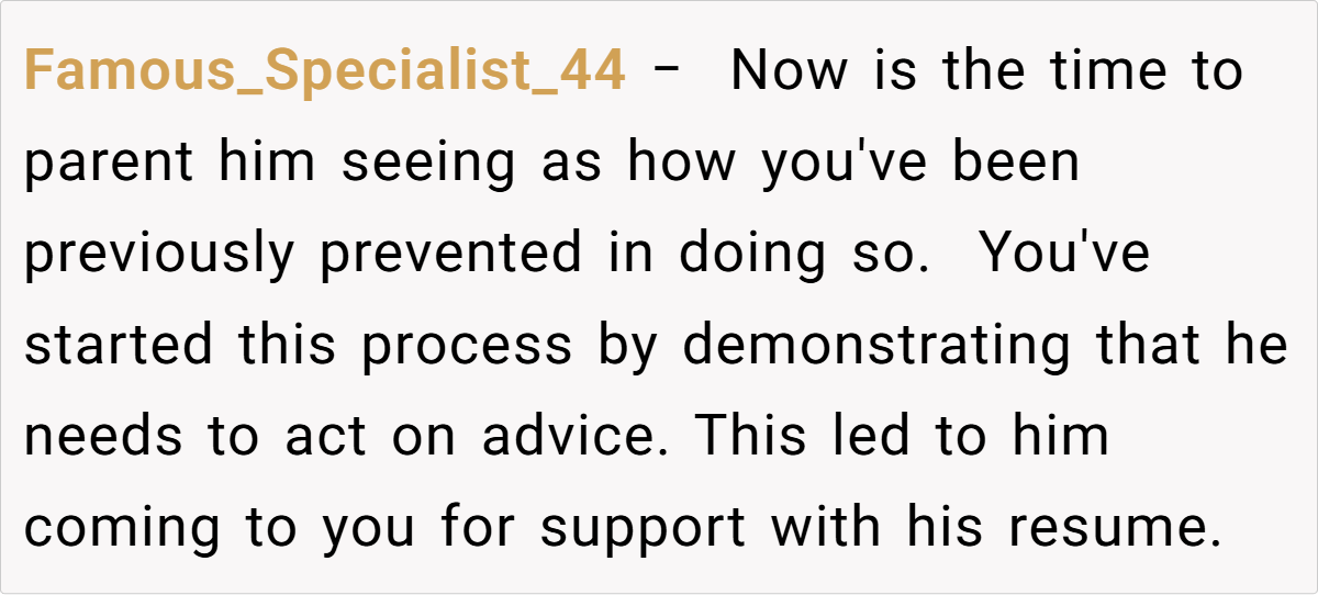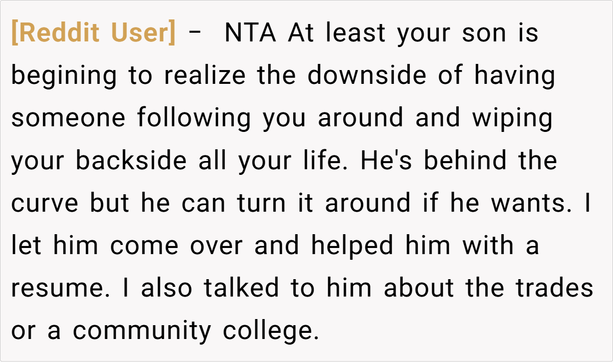 Ultimately, the OP’s decision to stop motivating his son financially isn’t about being unsupportive—it’s about fostering independence and accountability. By drawing a firm line, he’s attempting to break a cycle of overprotection that has hindered his son’s ability to function as an adult. While this tough love approach might sting in the short term, it may be the necessary push for his son to develop crucial life skills.