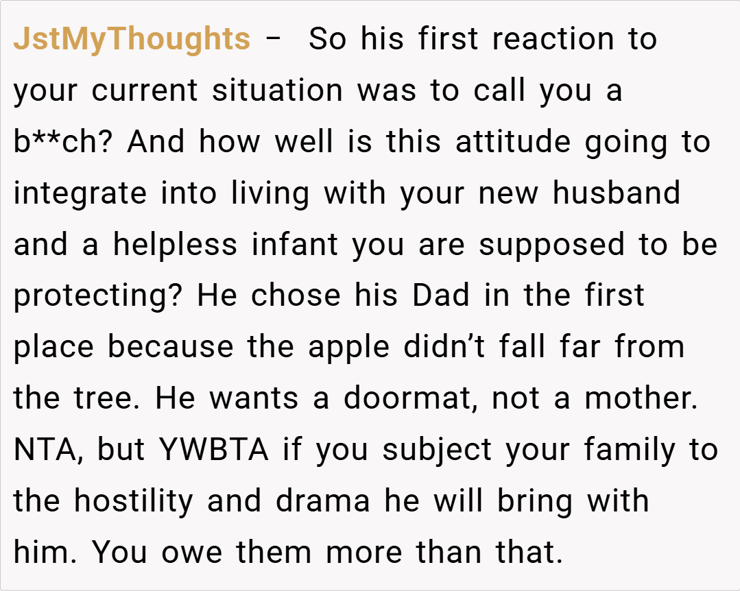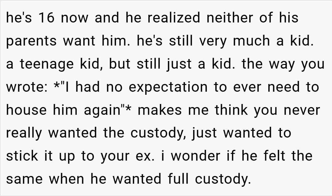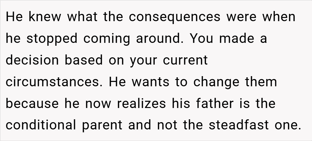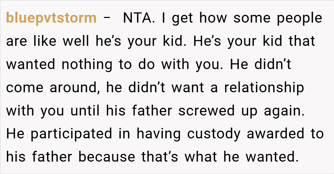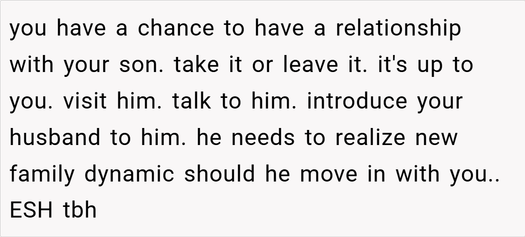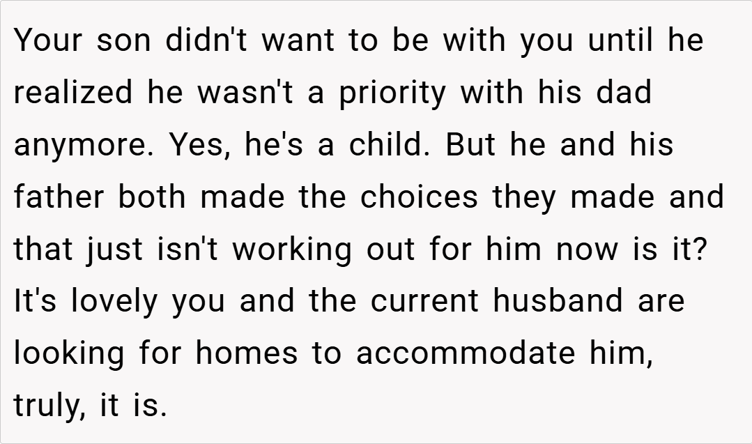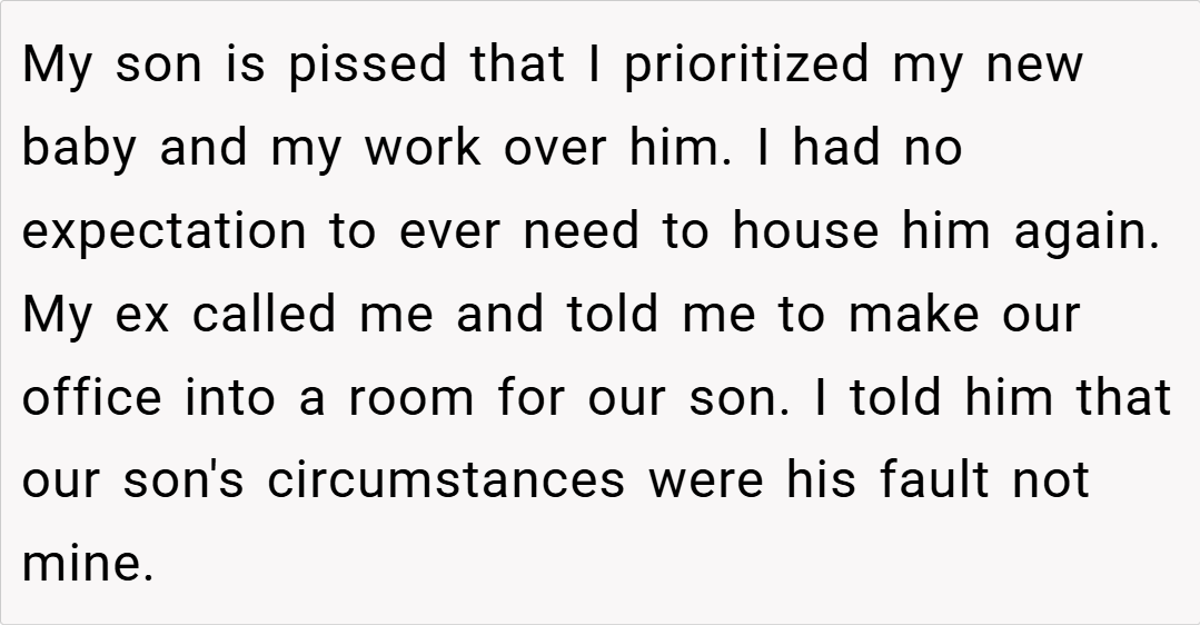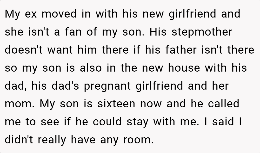 After divorcing his biological father years ago, her son had long chosen to live with his dad—and things had seemed settled. However, circumstances changed when she and her new husband downsized to a two-bedroom condo with a converted nursery and consolidated office space. When her son reached out, hoping to reconnect and live with her again, she explained that, with the new baby and her work priorities, they currently lack the space to accommodate him.
