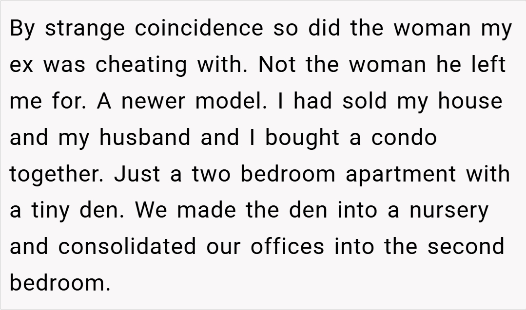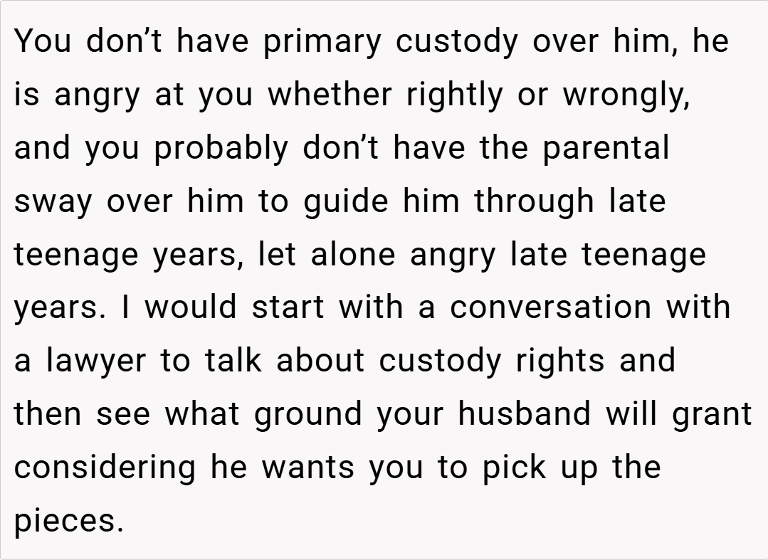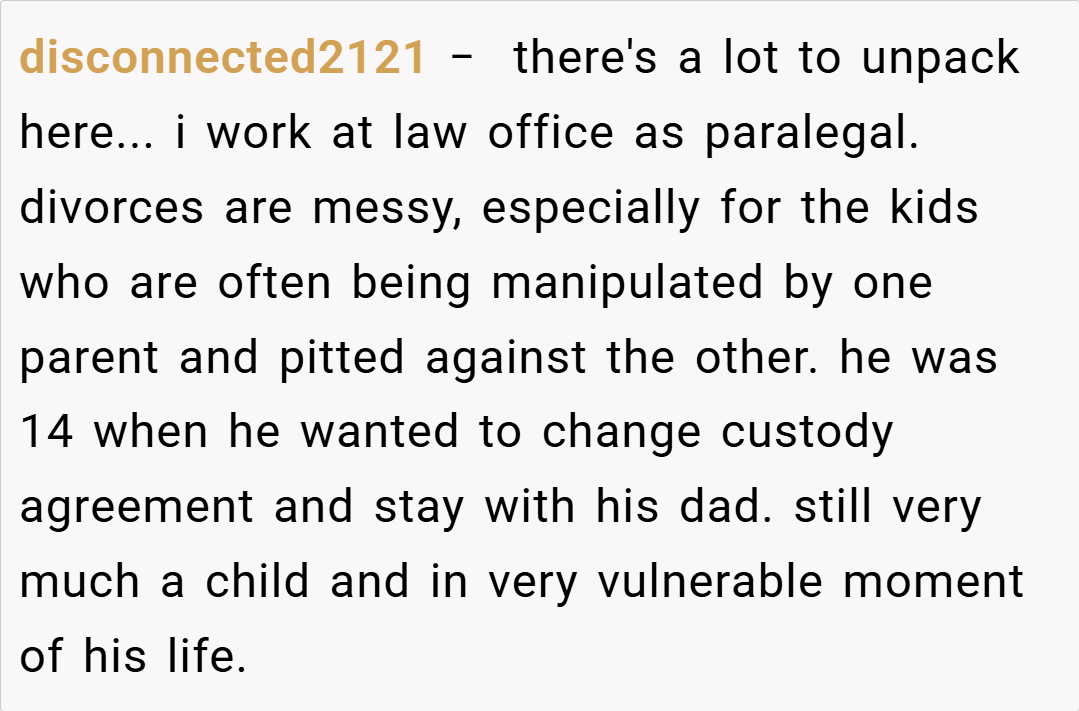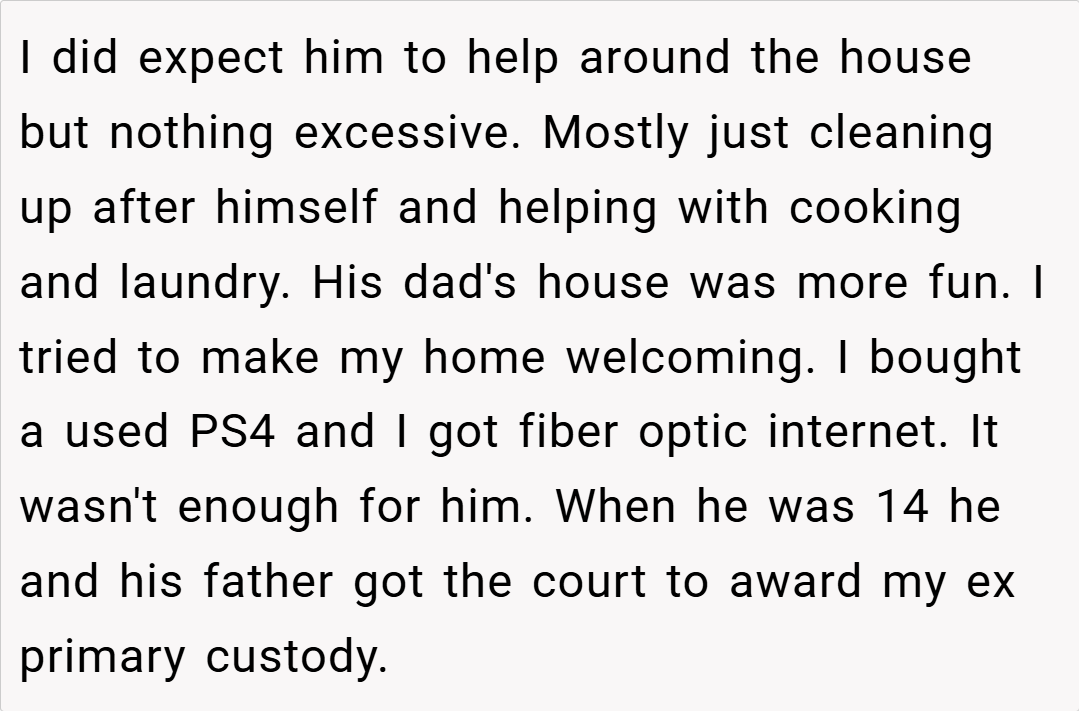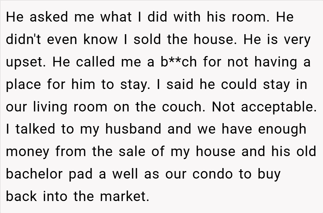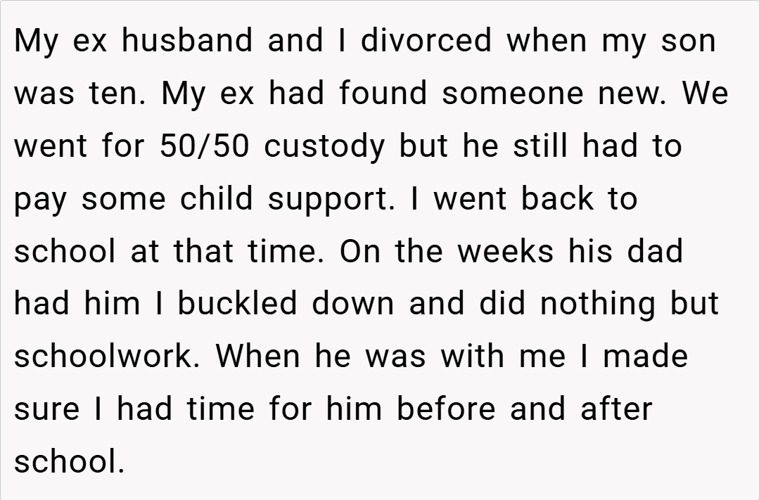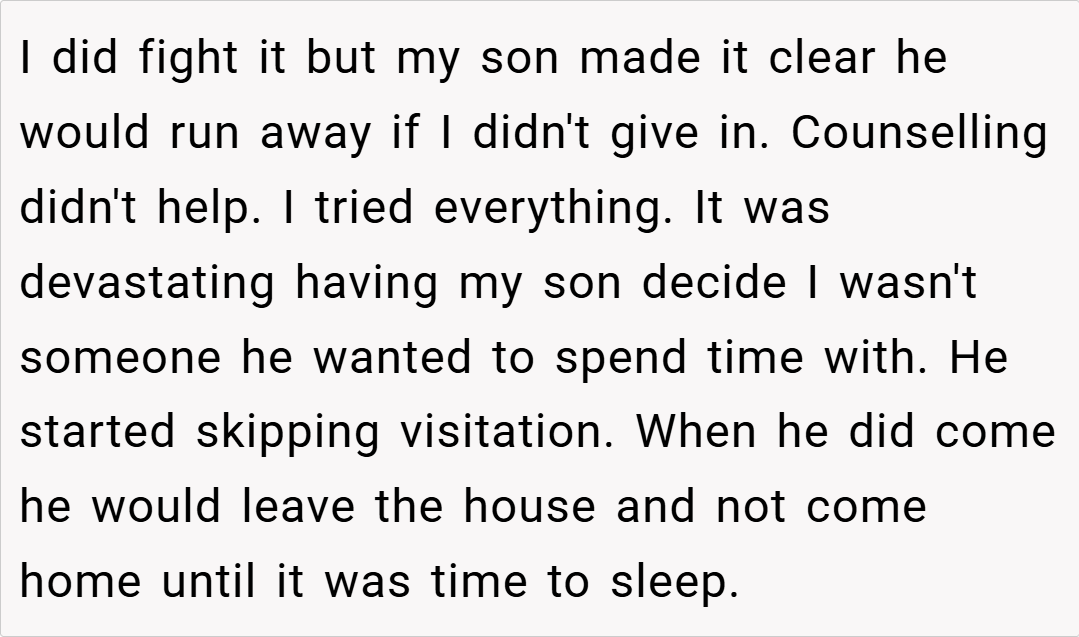 After divorcing his biological father years ago, her son had long chosen to live with his dad—and things had seemed settled. However, circumstances changed when she and her new husband downsized to a two-bedroom condo with a converted nursery and consolidated office space. When her son reached out, hoping to reconnect and live with her again, she explained that, with the new baby and her work priorities, they currently lack the space to accommodate him.