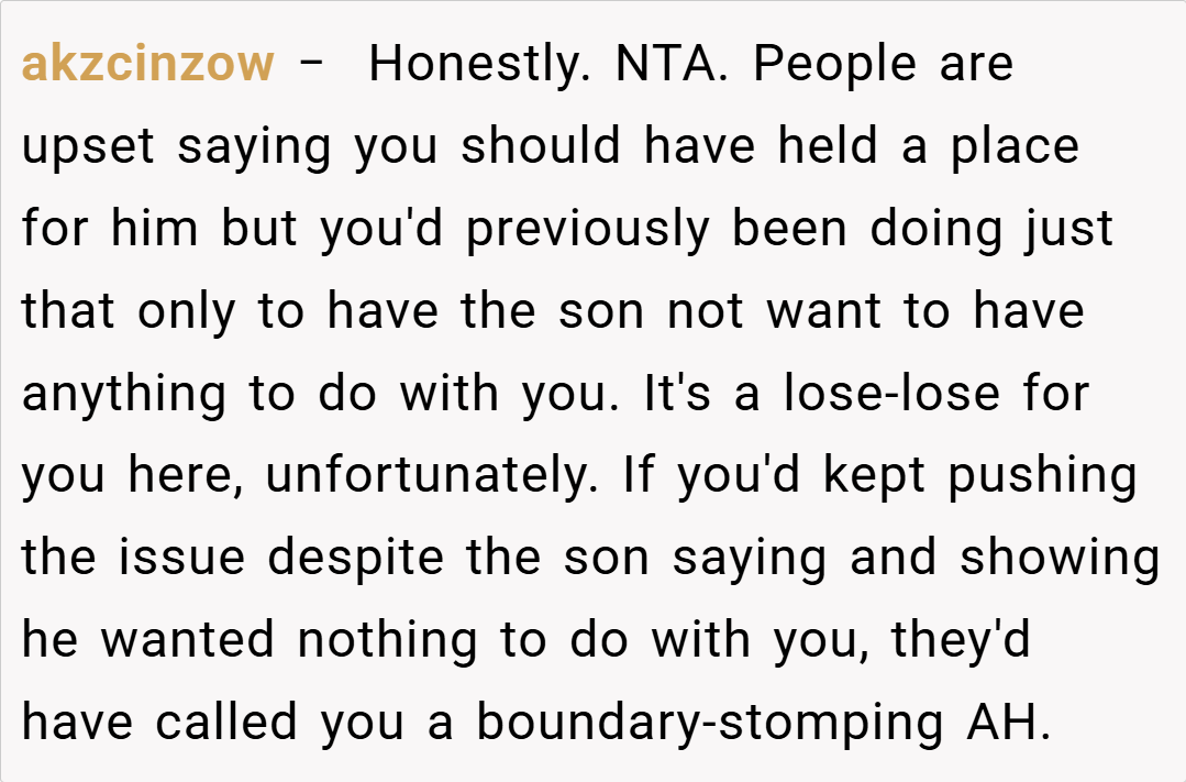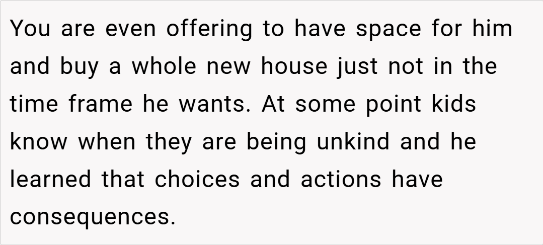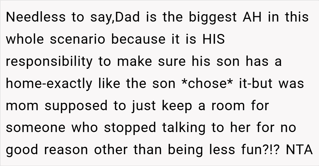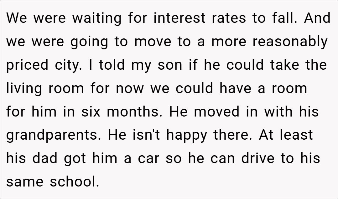 Her refusal wasn’t made lightly, as she promised that if he could manage the living room temporarily, a proper room might be arranged in six months. Yet, this decision has left him feeling rejected and has sparked heated family disputes. The question remains: Is she in the wrong for insisting that he live with his dad and stepmom instead?