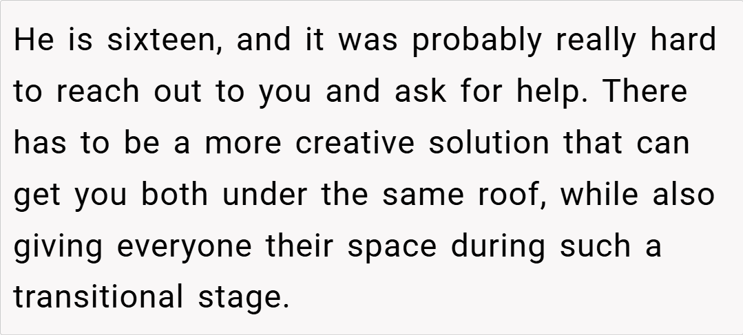 She suggests that the mother’s offer of an interim solution—having him live with his grandparents and potentially securing a room in the future—is a practical approach, albeit one that requires sensitive handling to avoid feelings of rejection.