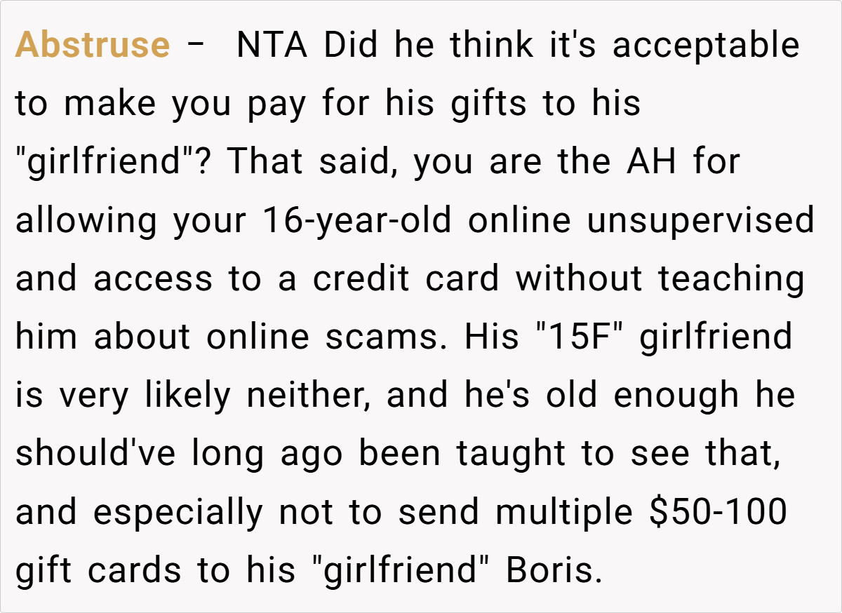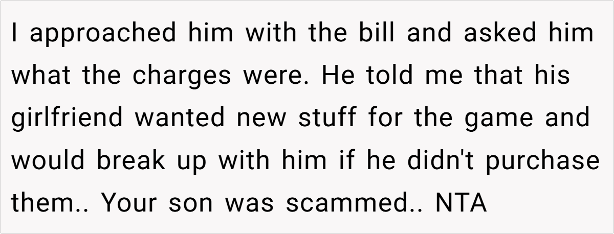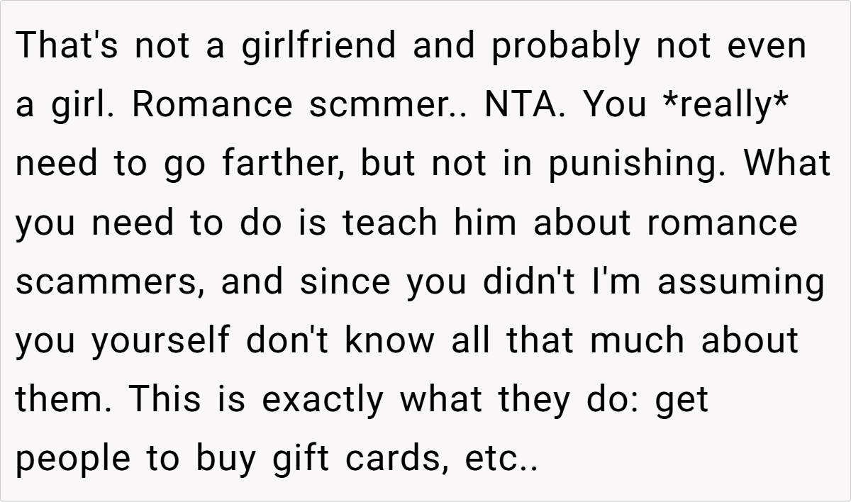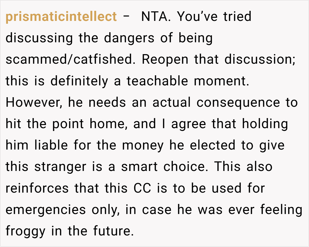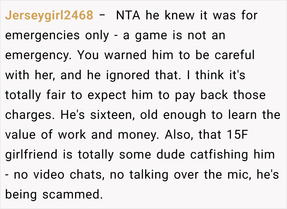 Across the board, Reddit users agree that the father’s actions are justified. The majority believe the son is being exploited by an online scam—and that his overspending was a direct result of that manipulation. Commenters emphasize that the credit card was meant strictly for emergencies, and using it to fund a dubious online relationship is irresponsible.