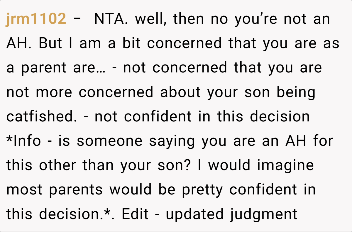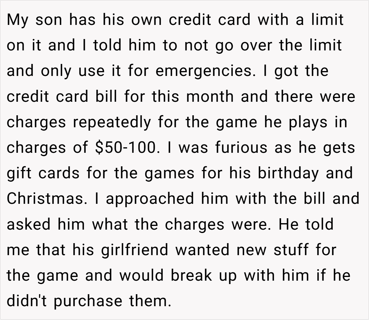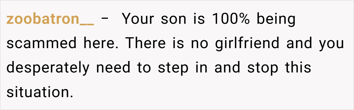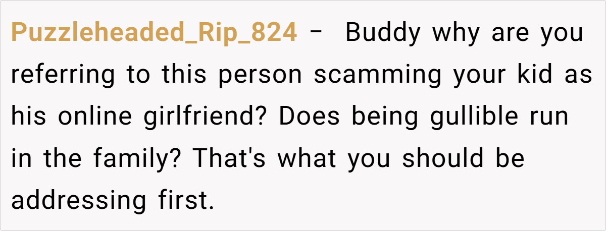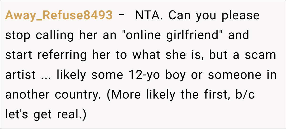 Across the board, Reddit users agree that the father’s actions are justified. The majority believe the son is being exploited by an online scam—and that his overspending was a direct result of that manipulation. Commenters emphasize that the credit card was meant strictly for emergencies, and using it to fund a dubious online relationship is irresponsible.