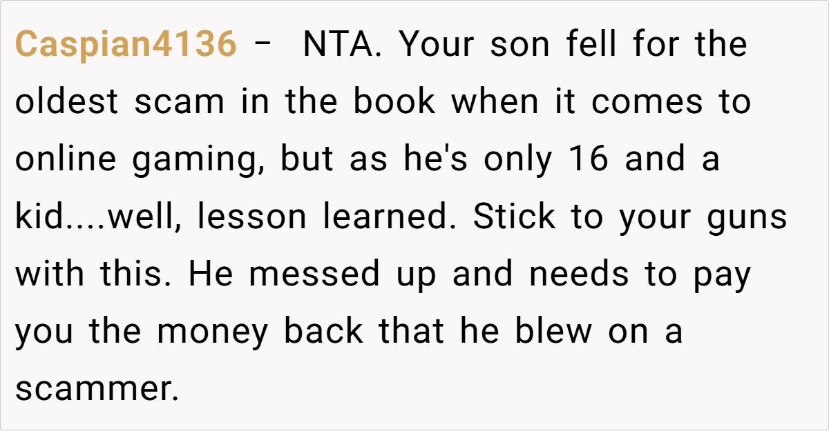 Many stress that the situation is a clear teachable moment, urging the son to learn about digital safety, financial responsibility, and the dangers of online scams. In short, the community largely supports the father’s decision to hold his son accountable for his actions.