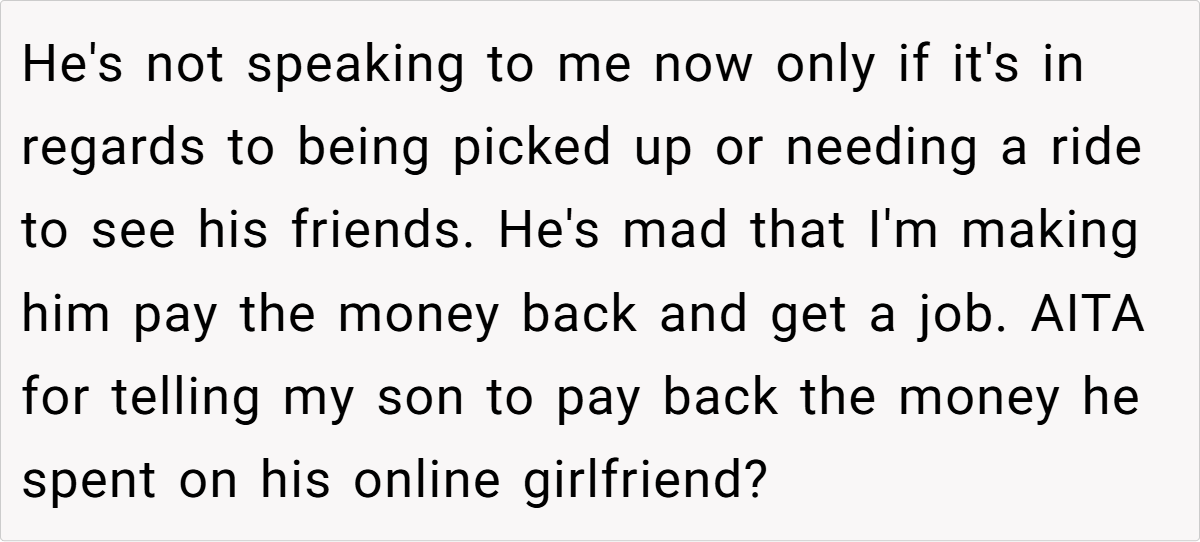 ‘AITA for telling my son to pay back the money he spent on his online girlfriend?’