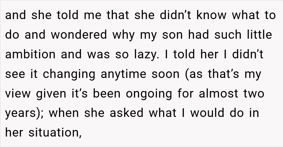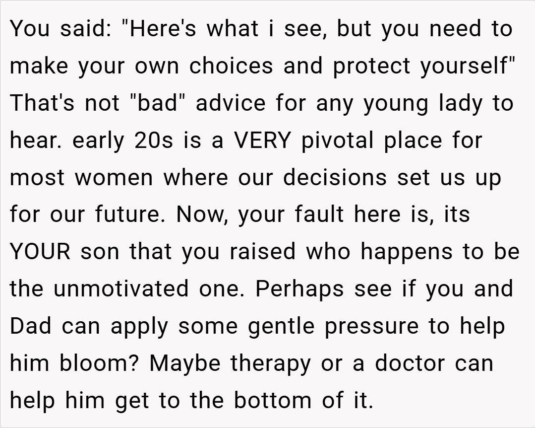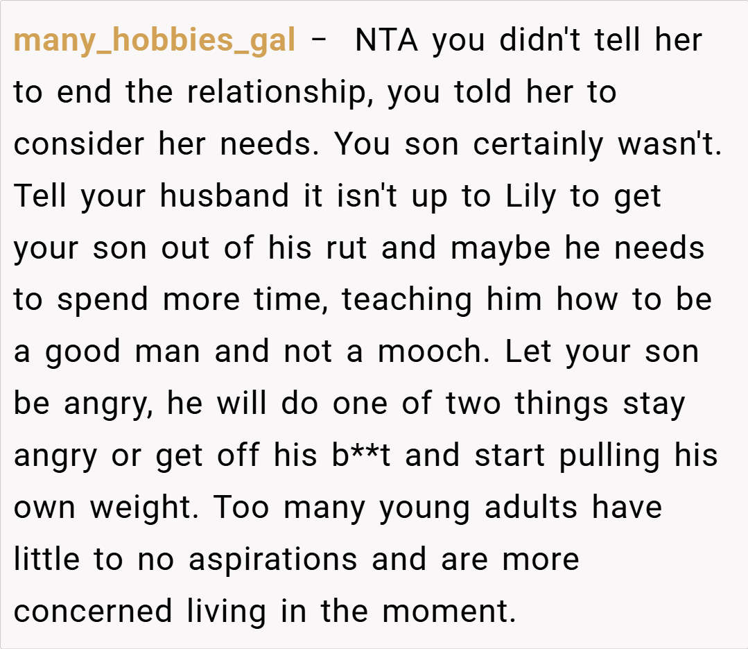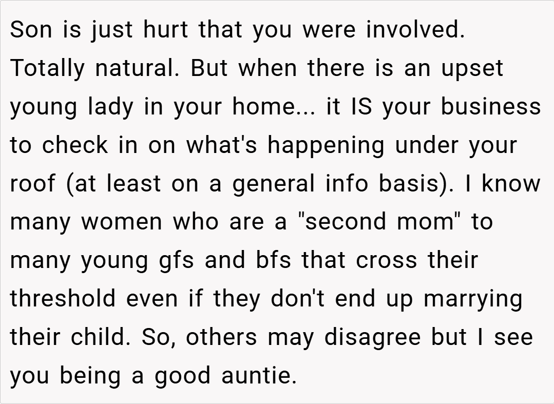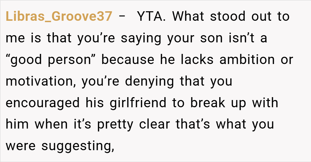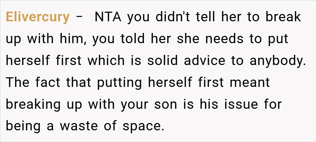 When confronted with her son’s declining ambition and his girlfriend’s obvious distress, she chose to offer candid advice that ultimately contributed to the end of a three-year relationship.