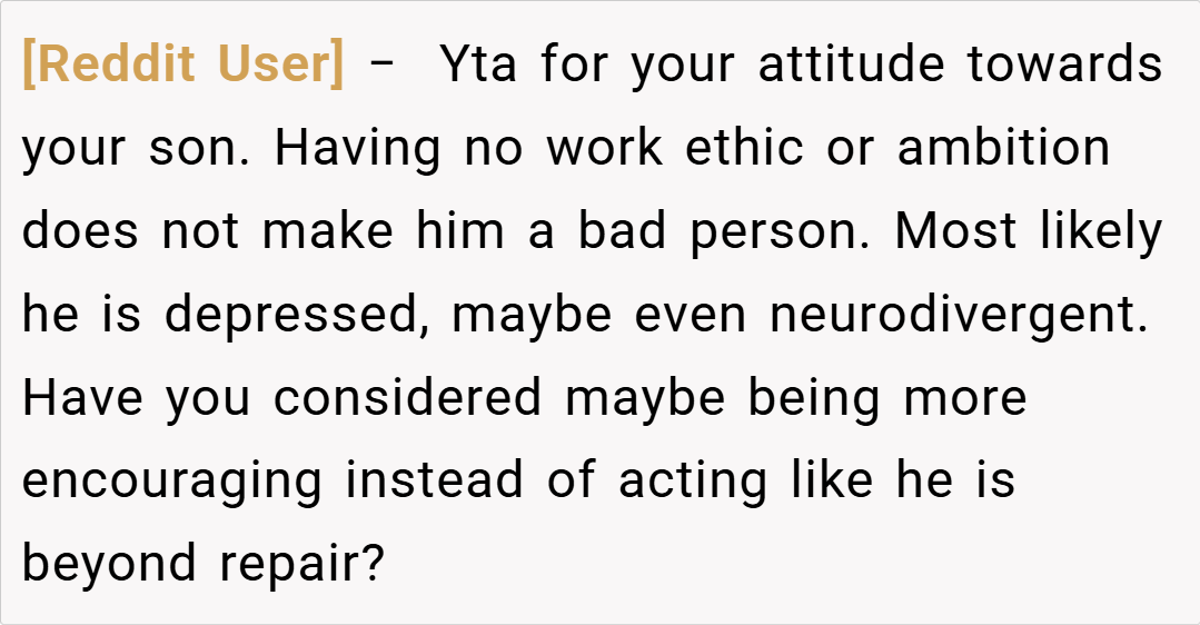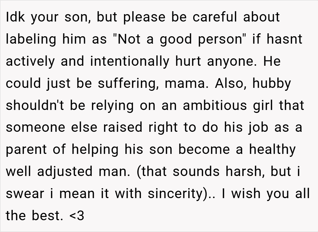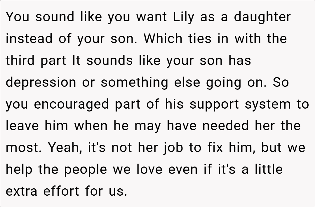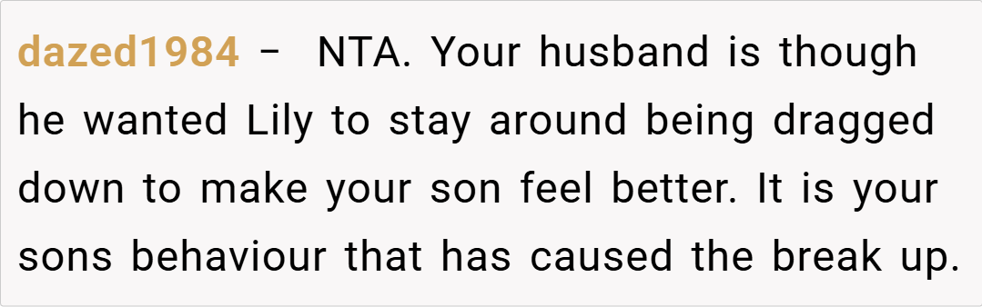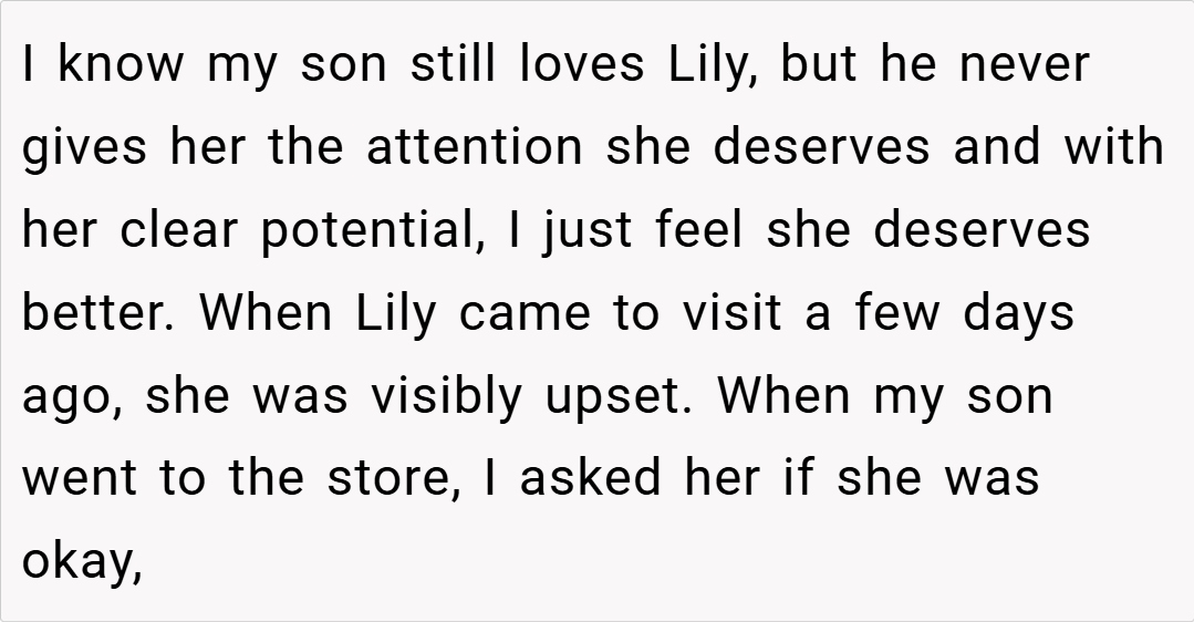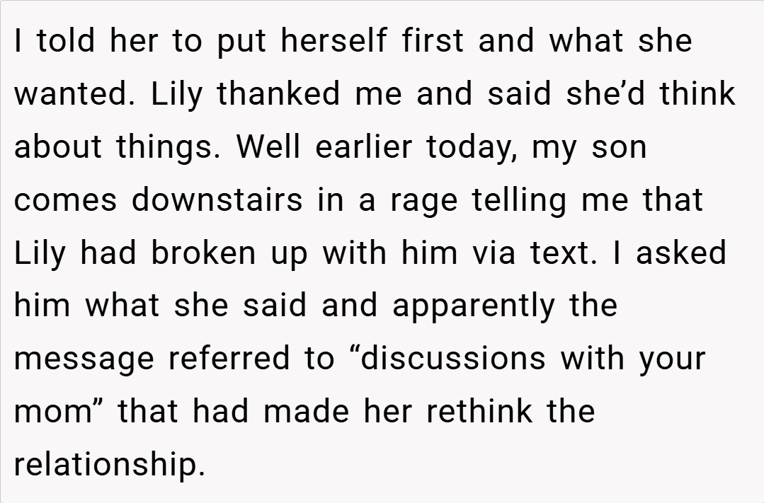 When confronted with her son’s declining ambition and his girlfriend’s obvious distress, she chose to offer candid advice that ultimately contributed to the end of a three-year relationship.