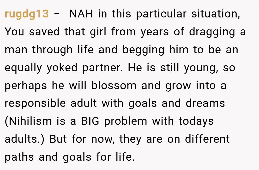 This case also raises questions about the ethics of intervening when seeing someone’s potential being potentially compromised. Studies show that emerging adults who date partners with significantly different ambition levels often experience relationship strain that can affect their own goal achievement.