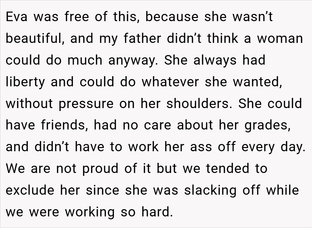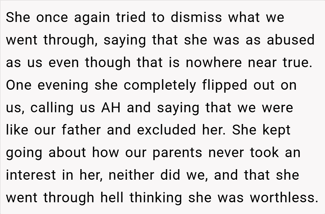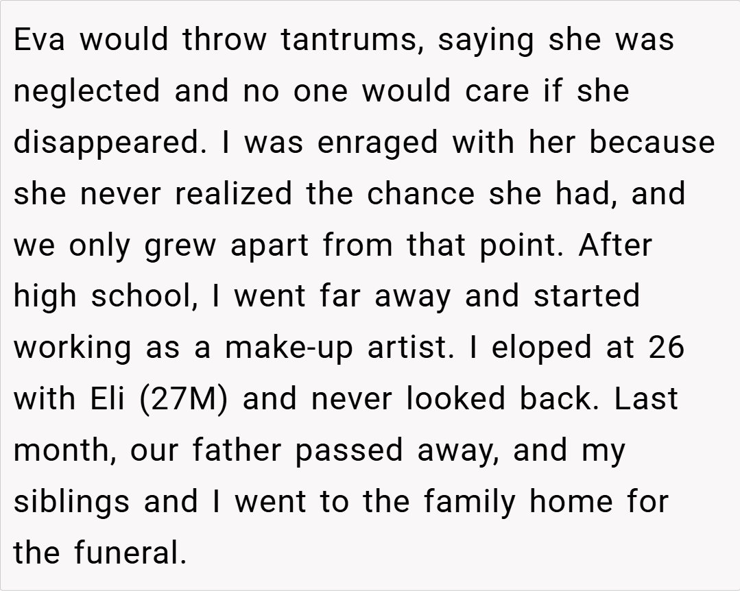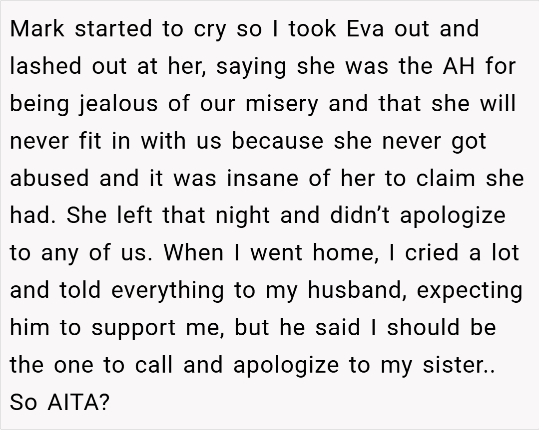 This imbalance has created deep-seated resentments that still linger today. During your recent family gathering after your father’s passing, when Eva lashed out and accused you all of exclusion, you responded by telling her she would never fit in with the family because she never experienced the same hardships. Now, you’re questioning whether your outburst was justified.