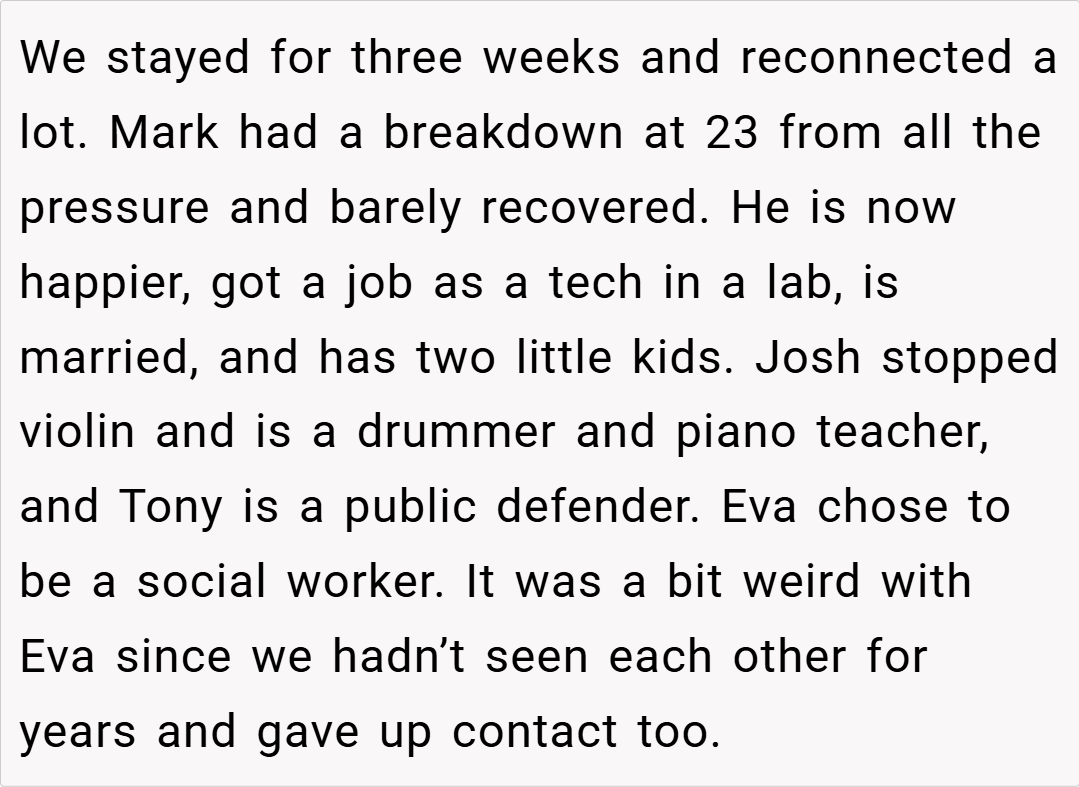 Family therapists stress that in situations of sibling conflict, especially within families marked by uneven parenting, every individual’s experience of abuse or neglect is unique and should be validated. Dr. Laura Markham, a specialist in family dynamics, explains, “Emotional neglect is not a one-size-fits-all phenomenon. One sibling’s experience of intense pressure and high expectations is different from another’s experience of being left to fend for themselves.