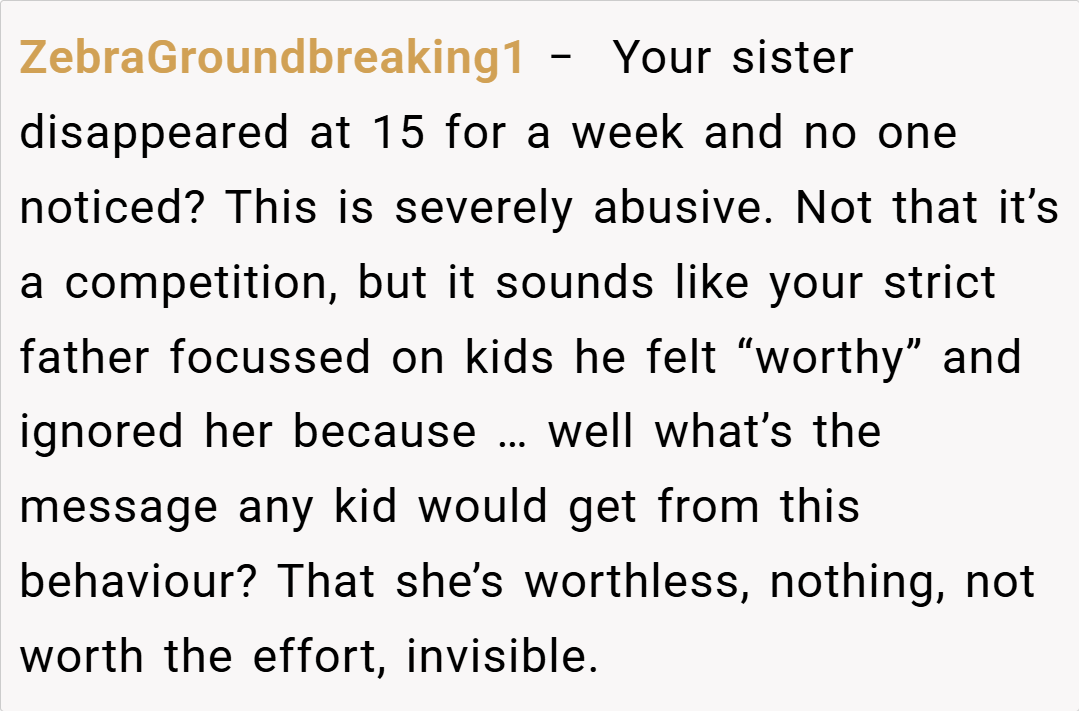 The tendency to measure each person’s suffering against another’s not only minimizes the pain of the less overt form of neglect but also prevents healing. A more constructive approach would have been to have an open conversation—perhaps in a mediated family therapy setting—where both your experiences could be shared, validated, and understood.