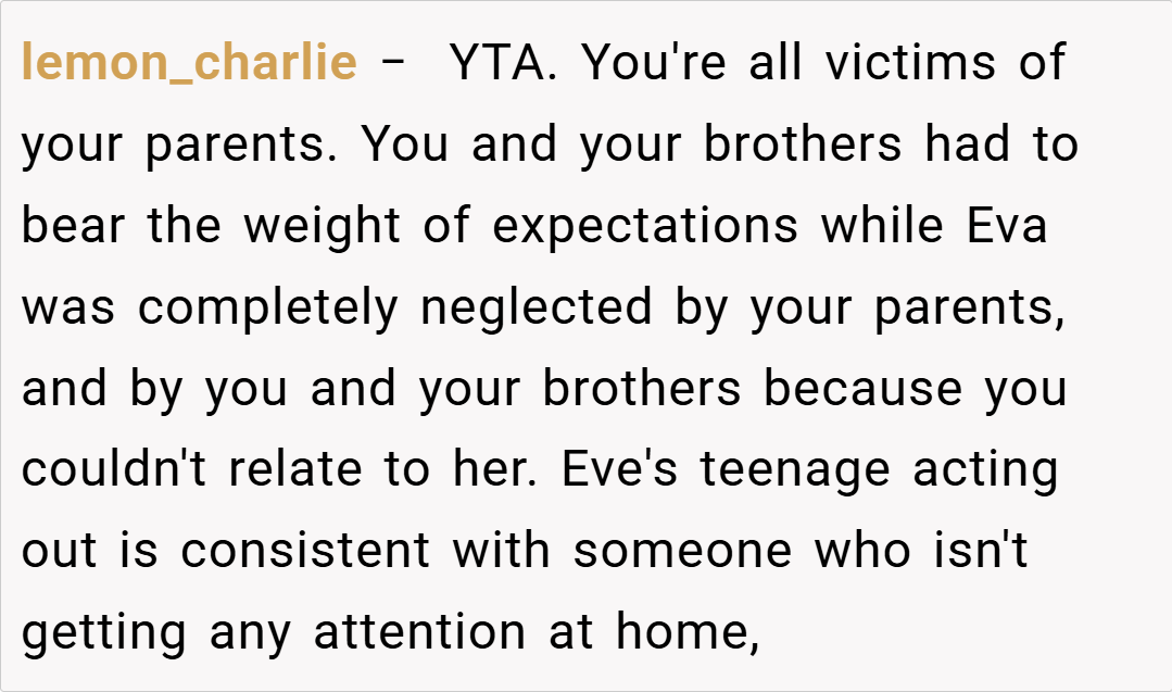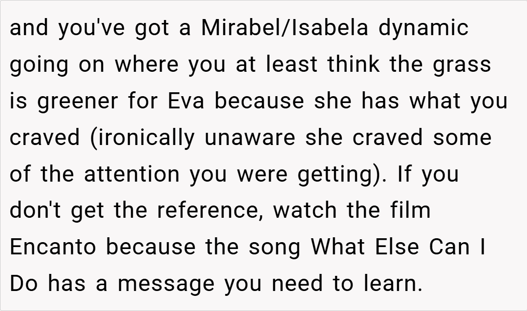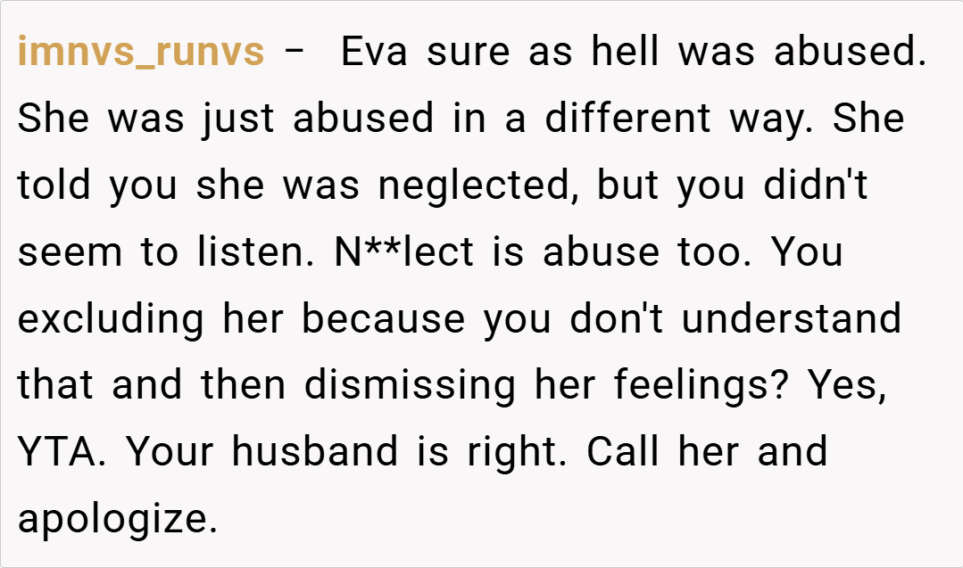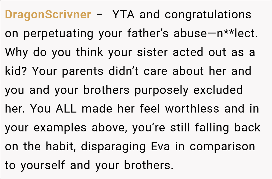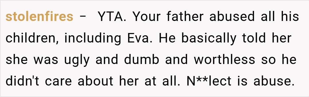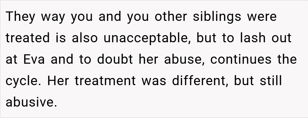 Both forms of treatment leave deep scars, and comparing them only fuels resentment.” Experts recommend that rather than dismissing Eva’s feelings as less severe because she wasn’t “abused” in the same way you were, it would be healthier to acknowledge that she experienced neglect that has also harmed her self-esteem and emotional well-being.