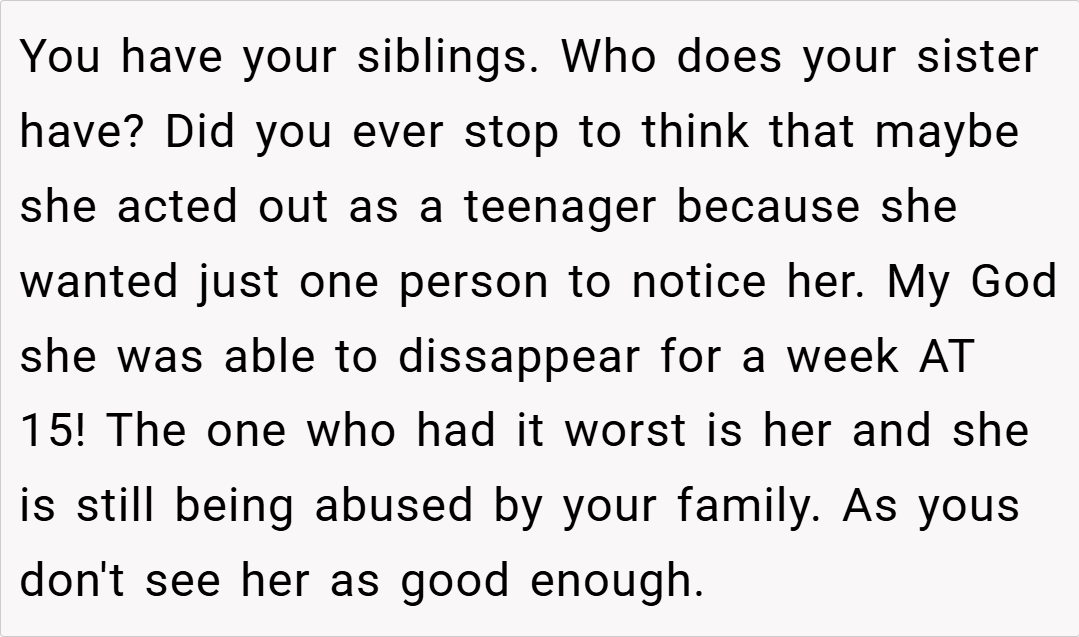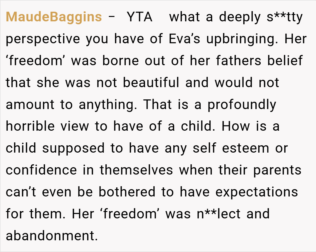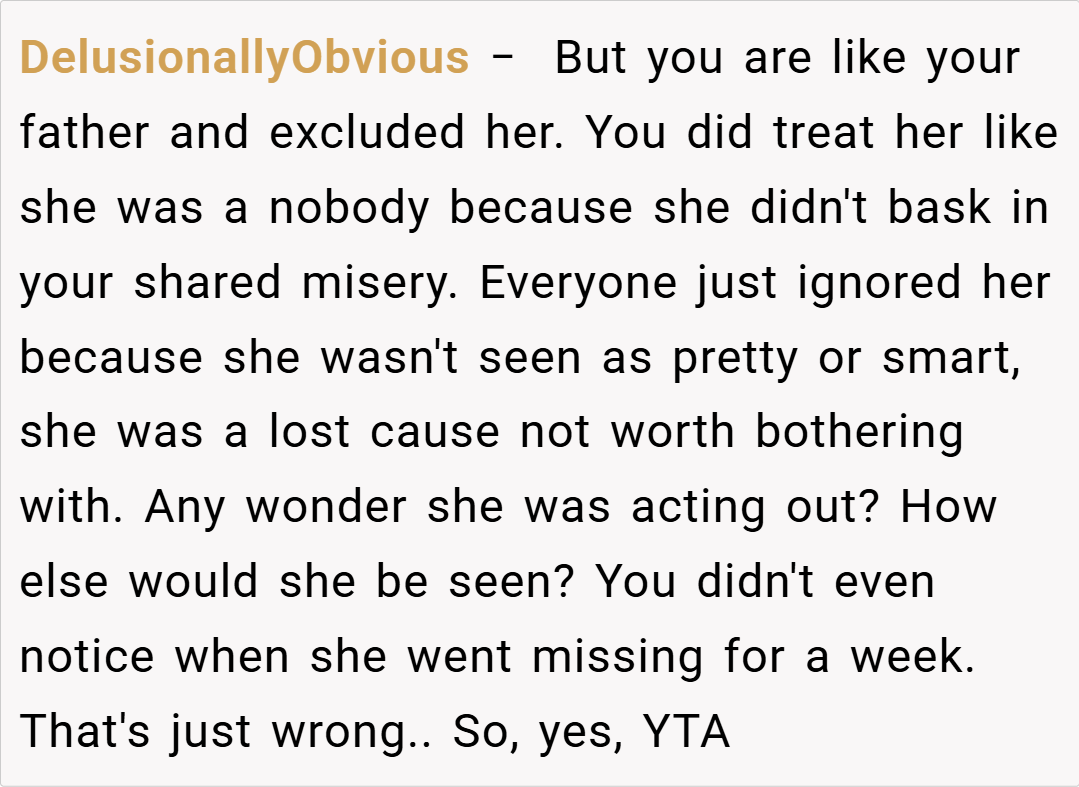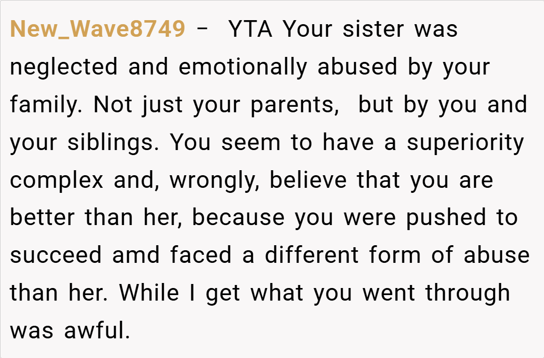 Both forms of treatment leave deep scars, and comparing them only fuels resentment.” Experts recommend that rather than dismissing Eva’s feelings as less severe because she wasn’t “abused” in the same way you were, it would be healthier to acknowledge that she experienced neglect that has also harmed her self-esteem and emotional well-being.