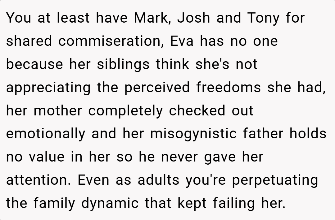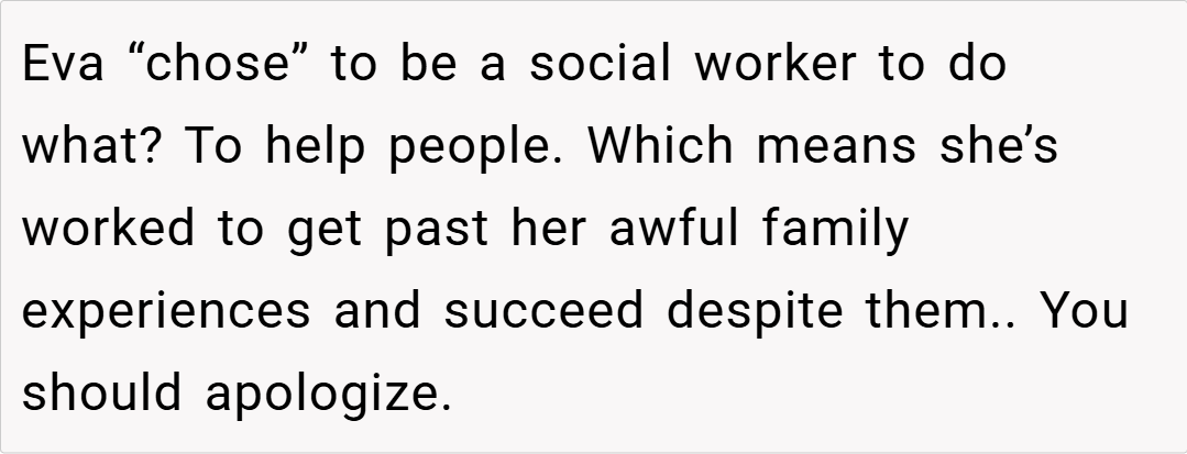 While your frustration is understandable, the way you expressed it may have been hurtful to Eva and could potentially widen the emotional rift between you. Family wounds run deep, and addressing them with compassion—rather than harsh comparisons—might lead to more meaningful healing.