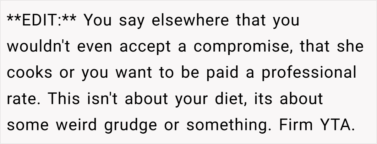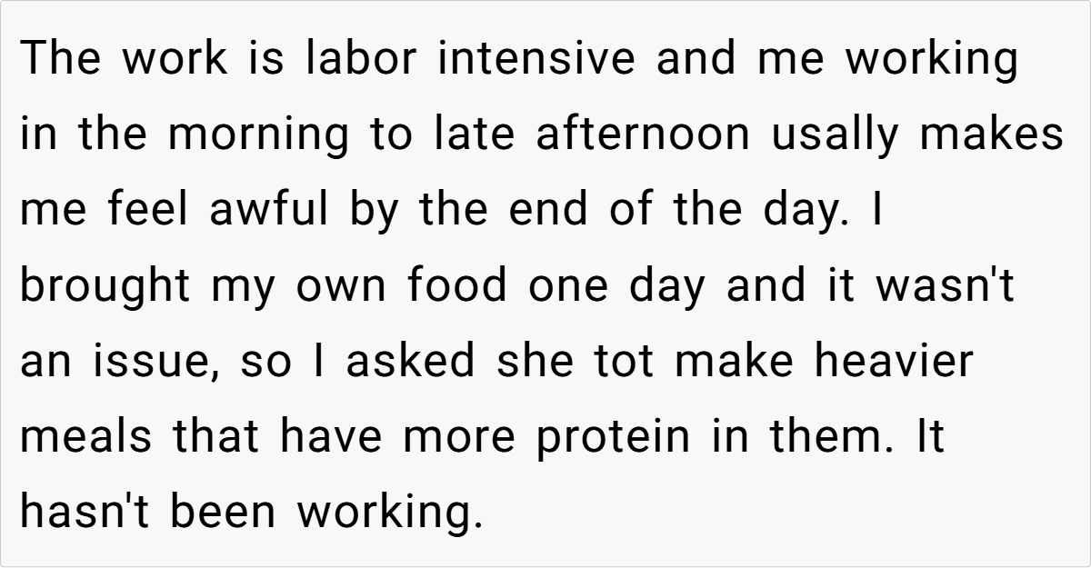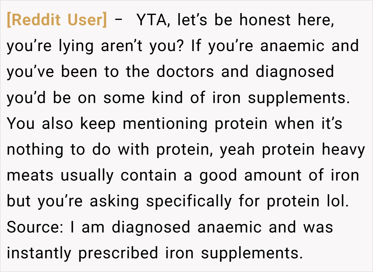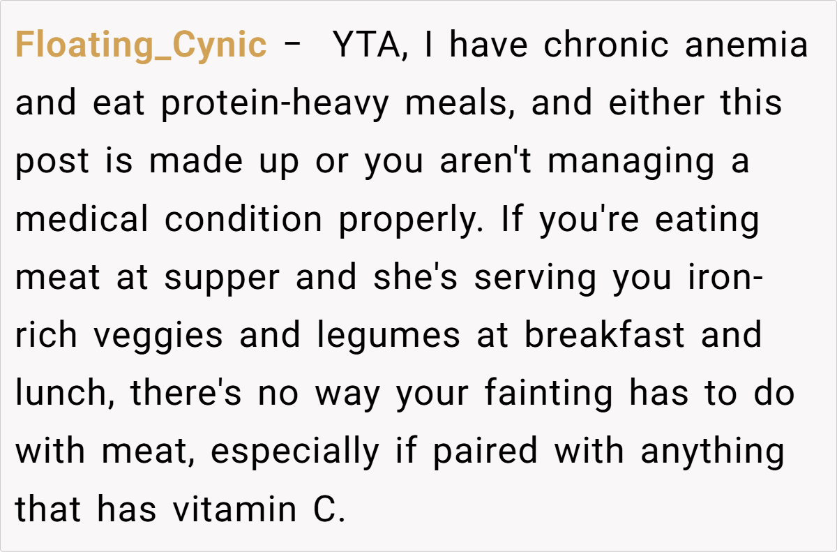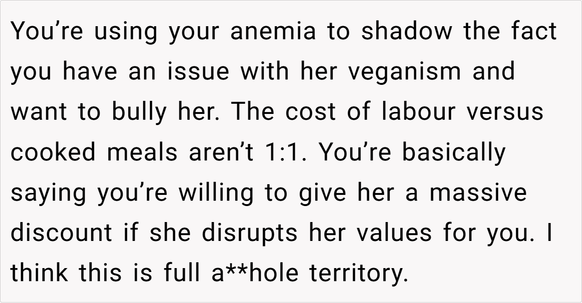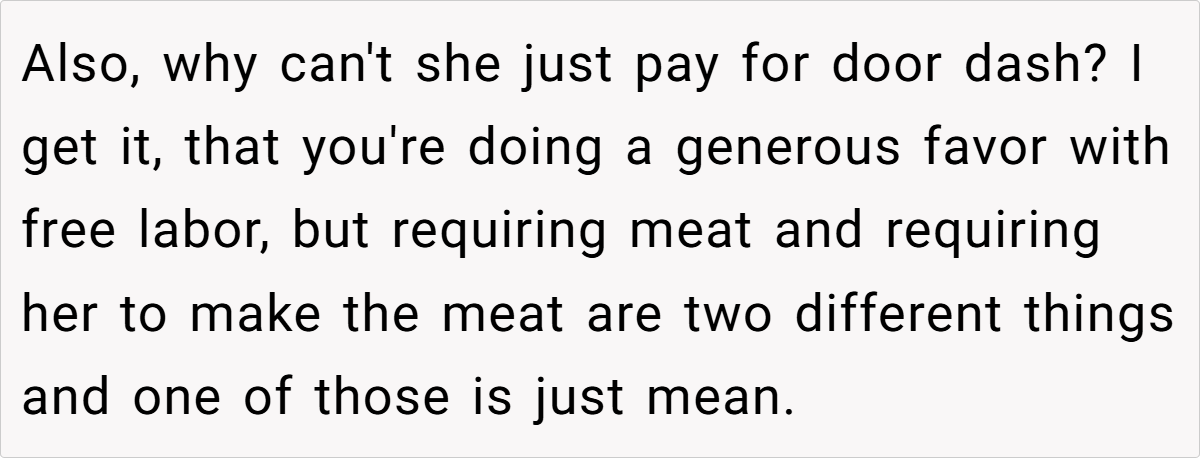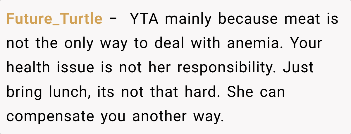 Furthermore, the situation raises questions about the balance between doing a favor and expecting proper care. When a favor involves physical labor, the provider deserves adequate support, including meals that meet their dietary needs. The OP’s insistence on meat-based meals reflects more than a culinary preference—it’s a necessity for managing her anemia.