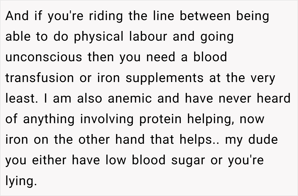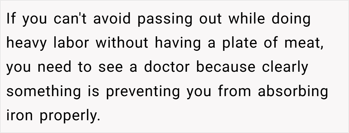 This highlights that while protein is important, the key issue often lies with iron levels, which are critical for sustaining energy during physically demanding tasks. The expert’s insight suggests that nutritional adjustments—whether through diet or supplementation—are necessary to avoid health risks when engaging in labor-intensive activities.