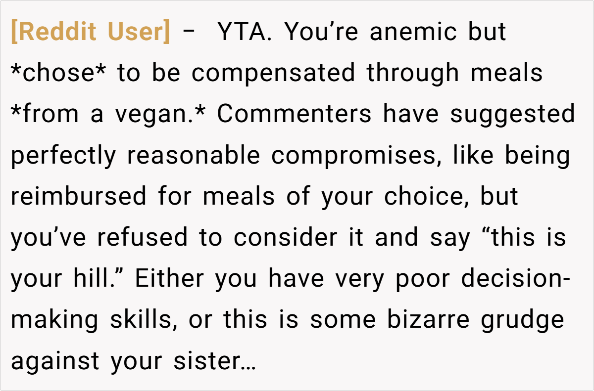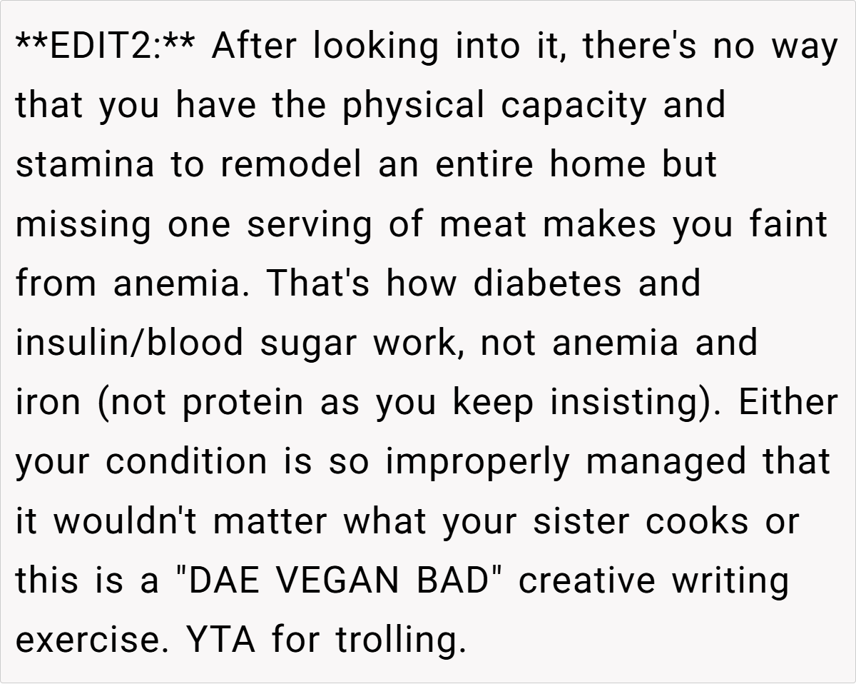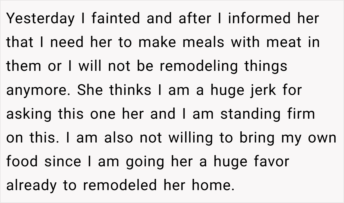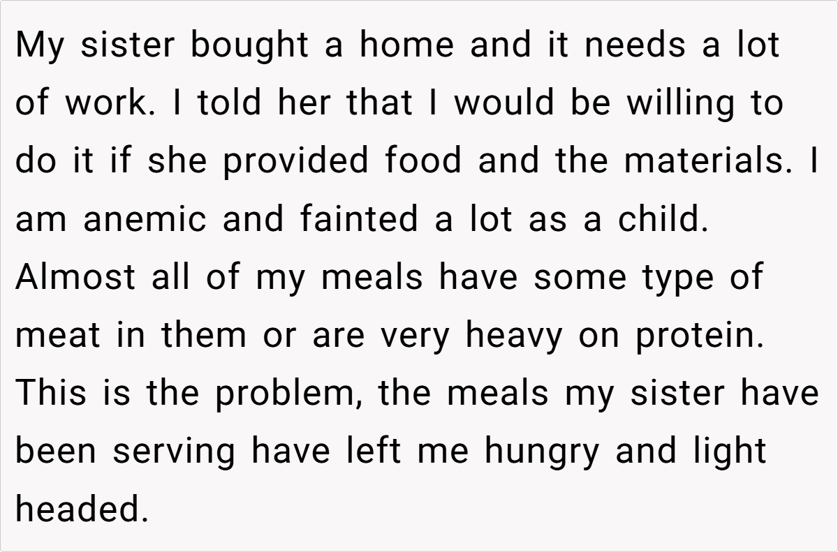 When family obligations mix with personal health needs, tensions can quickly rise. In this case, a promise to help remodel a sister’s new home turned sour when the meals provided failed to fuel the heavy labor required. The OP, who struggles with anemia, found that the protein-light, plant-based meals left her feeling weak and light-headed, jeopardizing both her health and the renovation project. Frustrated by repeated fainting spells and unmet nutritional needs, she finally issued an ultimatum—demanding protein-rich, meat-based meals or no more work.