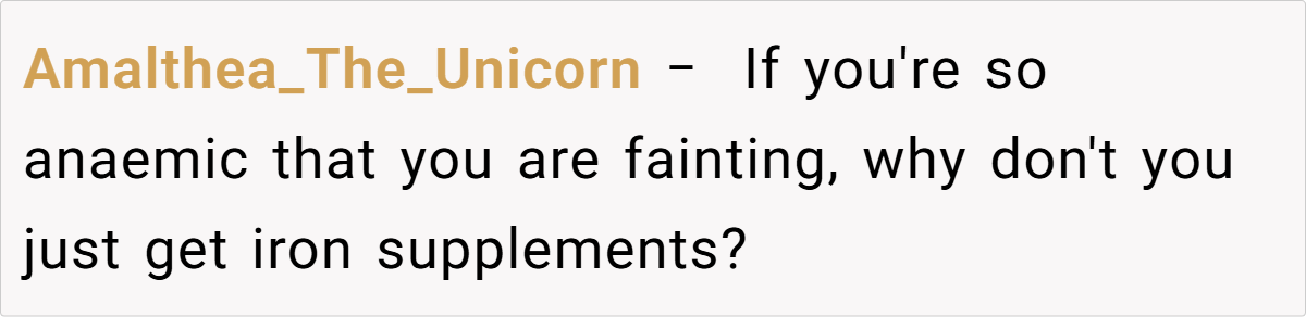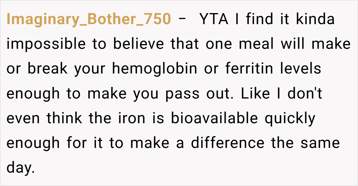The Reddit community offered a wide range of opinions on the matter. Some commenters suggested compromises such as receiving monetary compensation or ordering meals from outside, while others condemned the OP for making an uncompromising demand. The discussion was rife with debates over whether the issue was truly about anemia or an excuse for other underlying grievances. Ultimately, the diverse responses illustrate that balancing personal health with family favors remains a contentious topic.