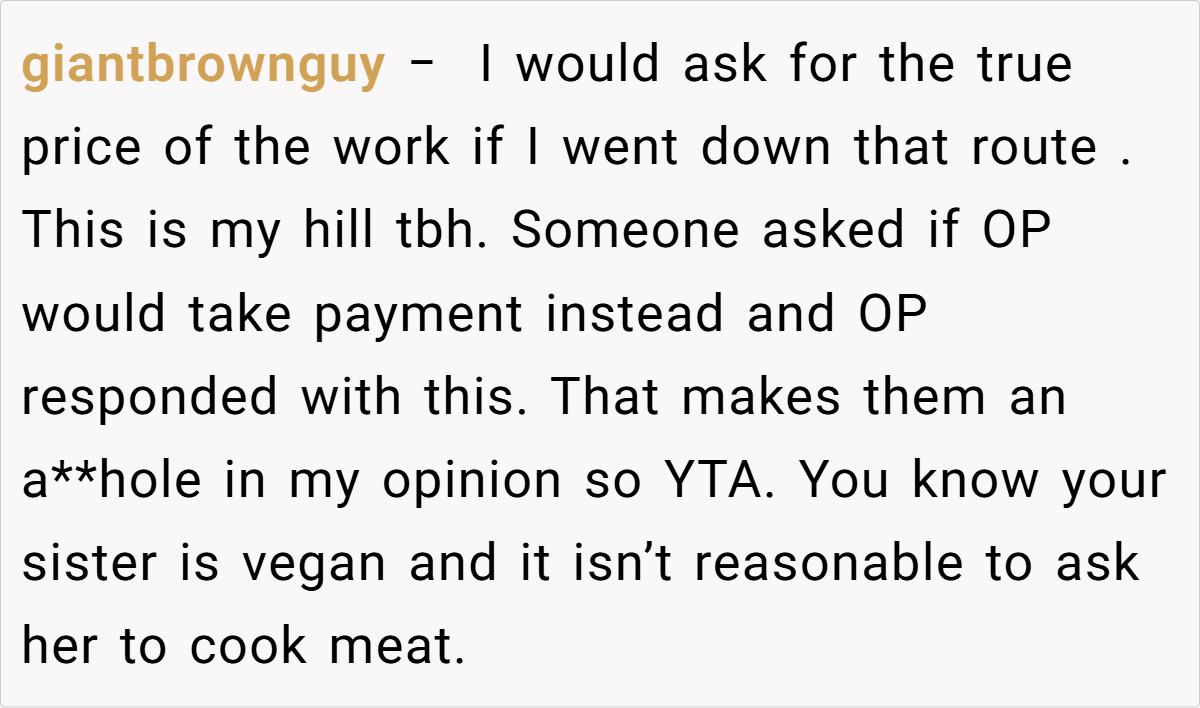 ‘AITA for telling my vegan sister that I will not remodel her home anymore if she doesn’t serve me meat?’