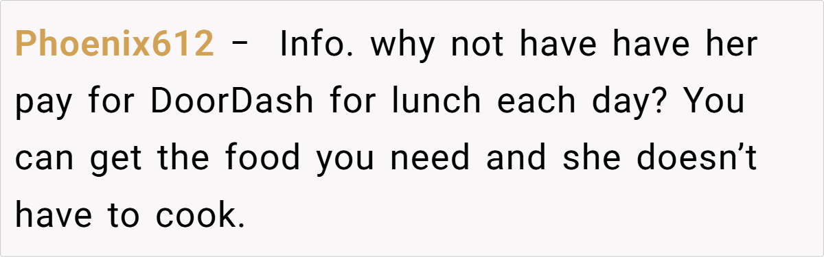 Another layer to this dilemma involves the dynamics of compensation for work done within the family. While some argue that payment in the form of nourishing meals is fair, others see it as a thinly veiled request for additional value. The OP’s refusal to bring her own food underscores her belief that she’s already providing a significant favor by remodeling the home.