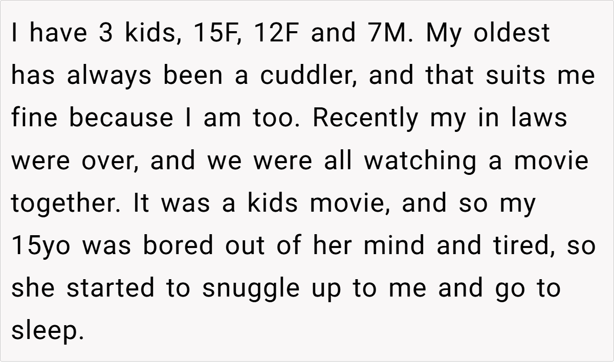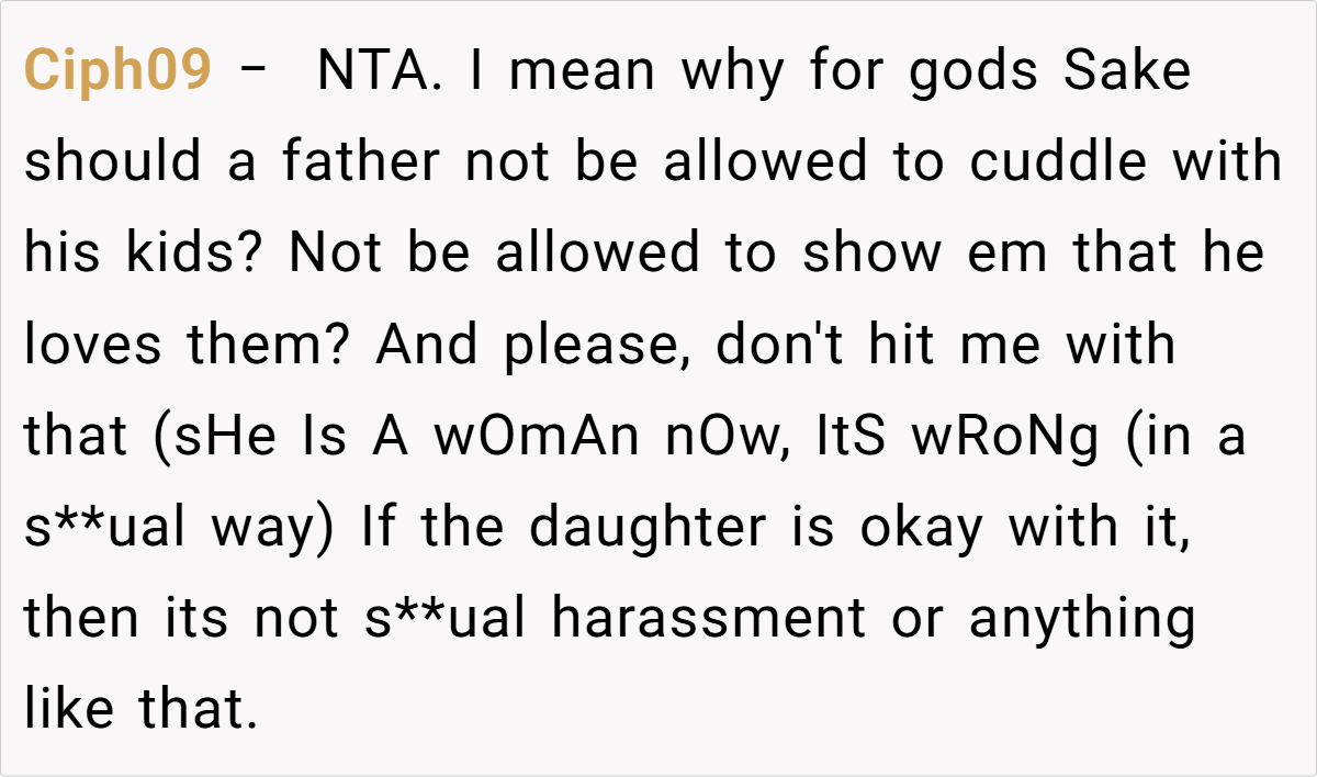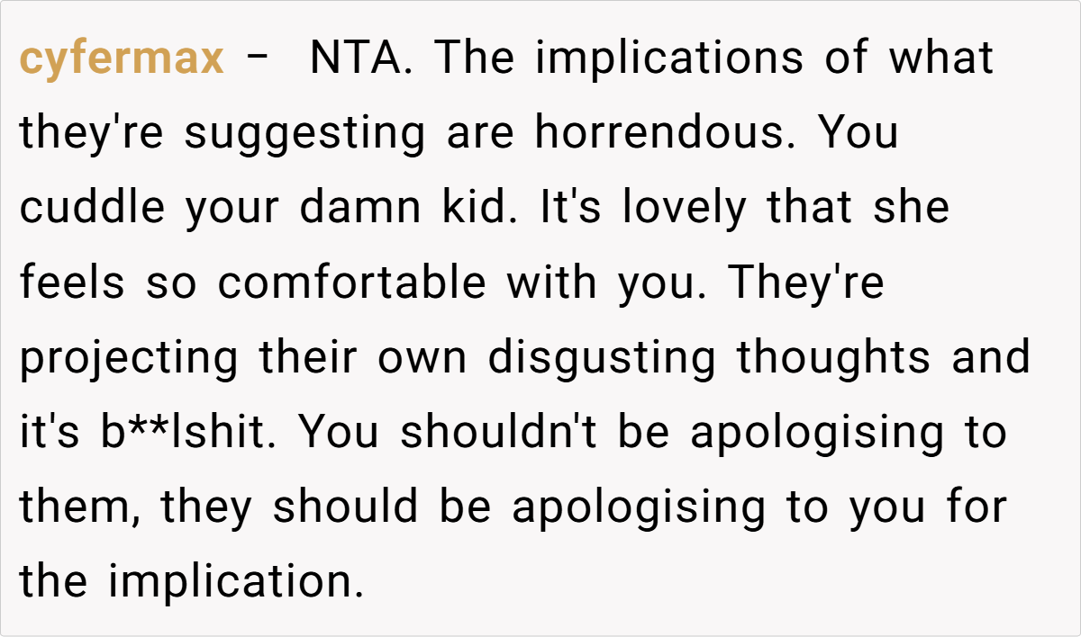 Family dynamics can be incredibly challenging, especially when external opinions constantly infringe on how you choose to parent. In this case, our OP’s natural act of cuddling his daughter—something he’s always done lovingly—is suddenly called into question by his in‑laws