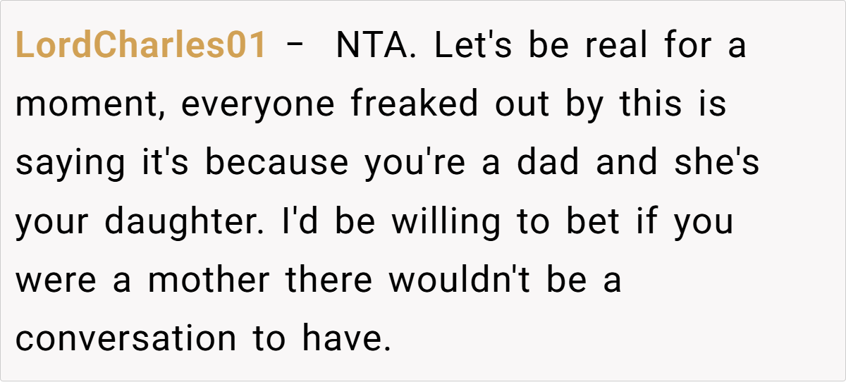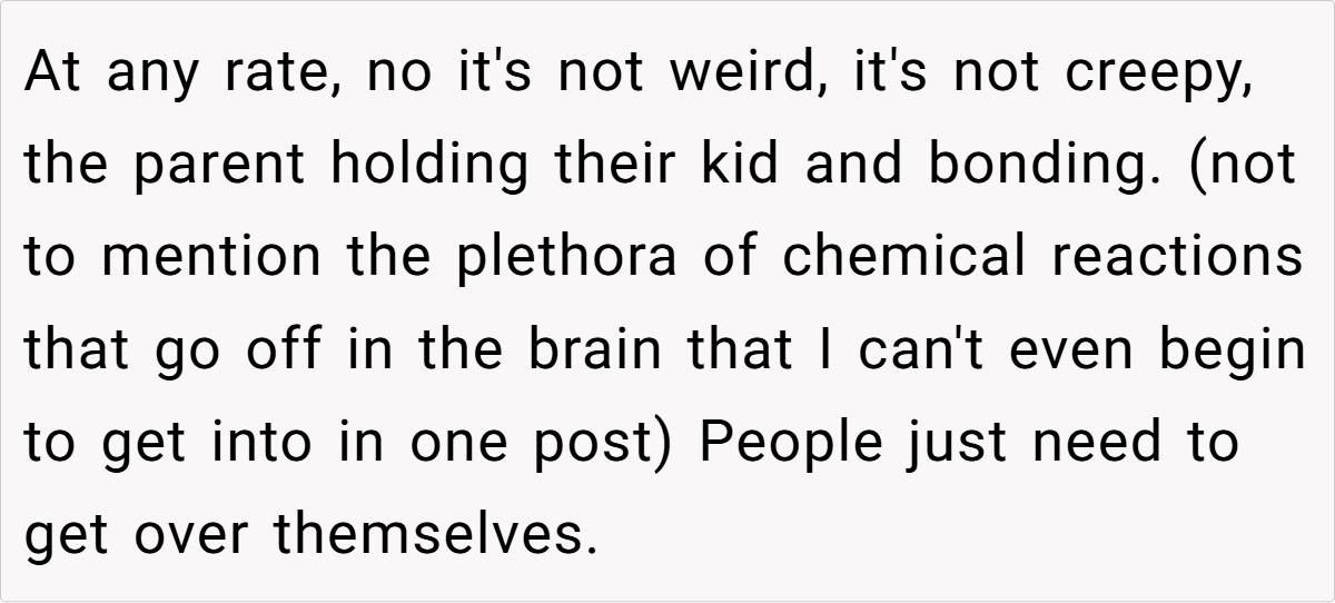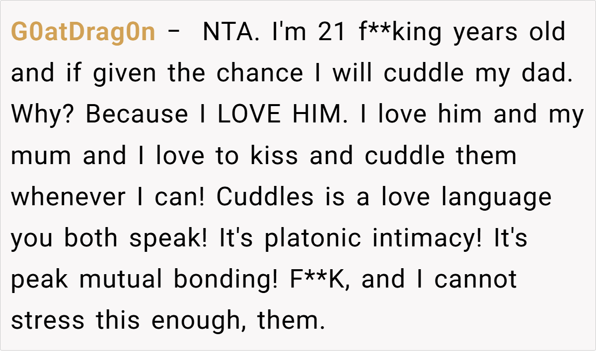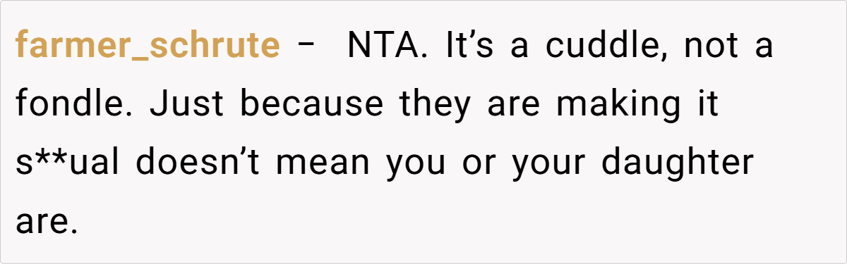 Family therapist Dr. Susan Johnson explains that “when family members impose strict ideas about what constitutes ‘appropriate’ affection, it can lead to deep-seated resentment if not addressed properly.” For our OP, the criticism was not merely about a cuddle; it was about invalidating his role as a loving, caring parent.
