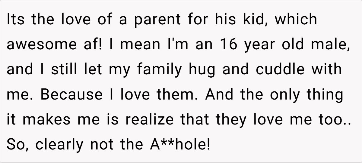 Overall, the Reddit community largely supports our OP’s decision to stand up for his way of showing love, with many emphasizing that a parent’s natural affection should not be criticized by others. Most commenters agree that setting clear boundaries—especially when repeated criticism has built up over time—is both justified and necessary for emotional well‑being.