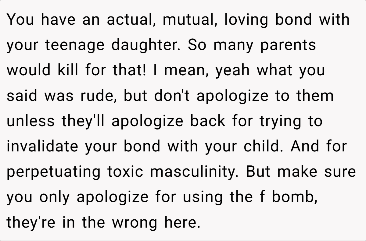 His harsh words, though blunt, stem from a desperate need to reclaim his parenting space and assert that his way of showing love—especially to his daughter—is both normal and cherished. In situations like these, experts stress that while a softer approach might sometimes ease tension, sometimes a strong boundary must be set to stop the cycle of disrespect and preserve one’s emotional health.