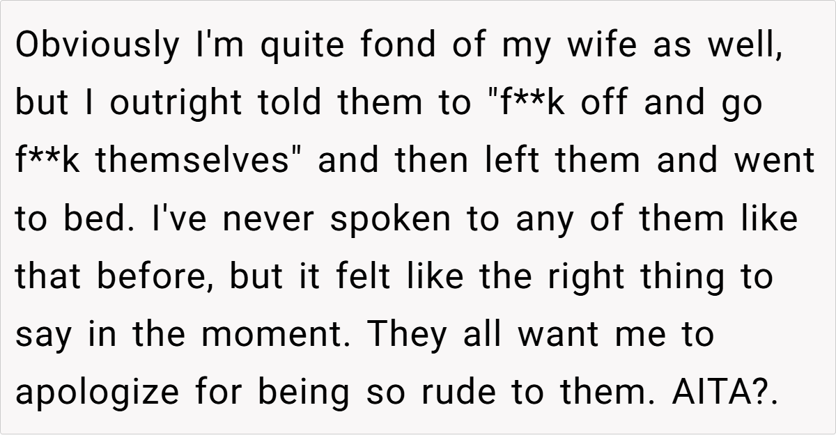 My wife loves a cuddle too… and of course she’ll get involved with us both and is an amazingly awesome mum…But my IL, not so much. So we’ve got a kid who’s has both sets of grandparents who are NOT nurturing. This is therefore the kind of comment I got… my reaction… you guessed it “fu*k off!” Followed by, “he’ll be a teen soon and the day will soon come when he doesn’t want to cuddle me or spend time with his dad; don’t you dare try and take that away from me or make it feel weird about it. If he wants to cuddle, he can have a cuddle! I love my son and he loves me, just because in your day it might have been different, I’m my own person and I’ll always aim to give him what I never had! ” End of the conversation everyone feeling awkward. Now, here’s the strange thing… my wife, sat in silence and pondered what they said and ‘kind of’ agreed with them… nodding her head etc; we discussed it that night after they left and I told her that her response broke my heart… So why is your wife not overly the AH… for your wife, a situation like that and her agreeing immediately with you. Is telling her family to their face that they did a sh*t job as she never had that kind of love and attention. She is put on the spot and has ‘maybe’ sided with her parents knowing that later she has the opportunity to apologies and explain to you how she felt trapped; keep the peace kind of thing.