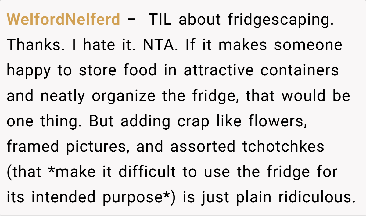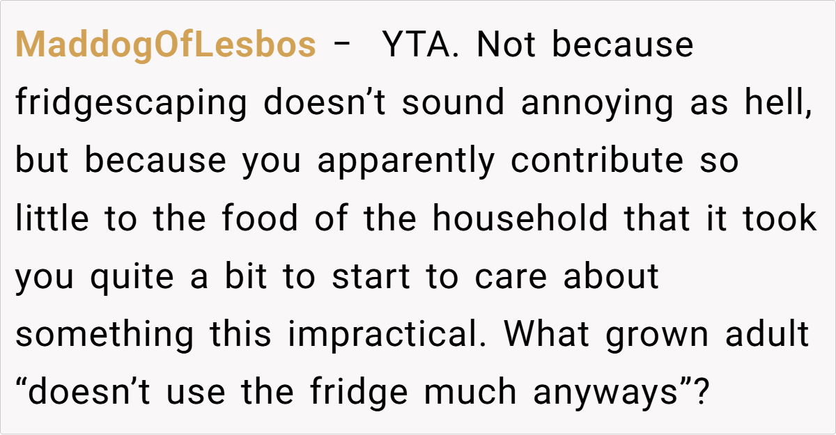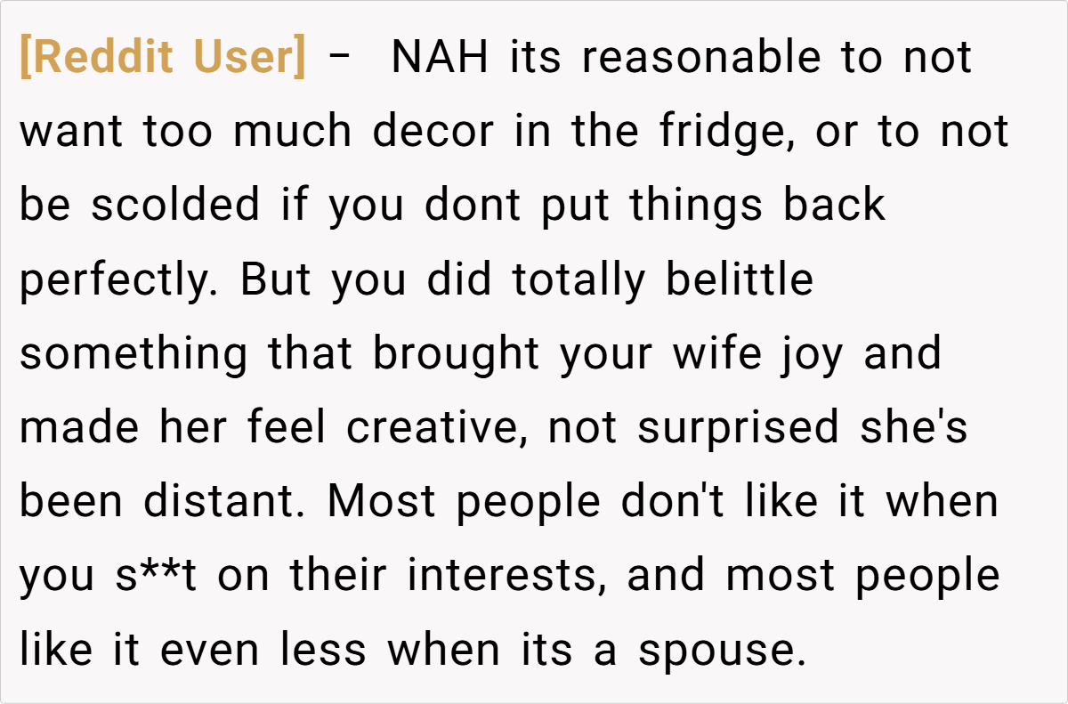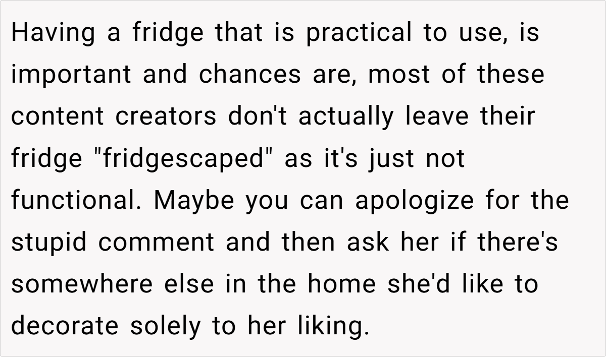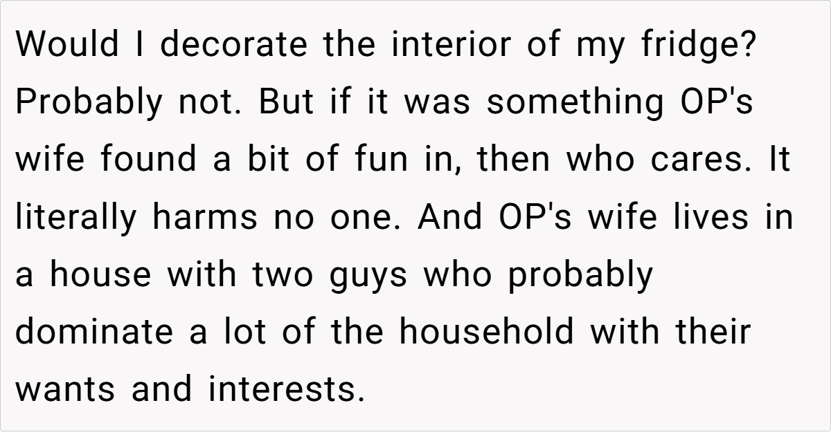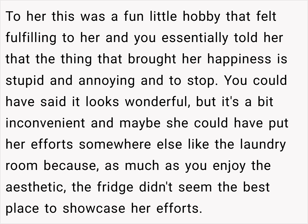 The community’s responses ranged from light-hearted critiques to more pointed advice, with many urging the husband to reconsider his choice of words and embrace a more empathetic tone. While some found his frustration understandable given the practical inconveniences, others felt that dismissing his wife’s creative outlet was a bit harsh. These diverse opinions highlight that, ultimately, the issue isn’t just about a decorated fridge—it’s about finding common ground in a shared living space.