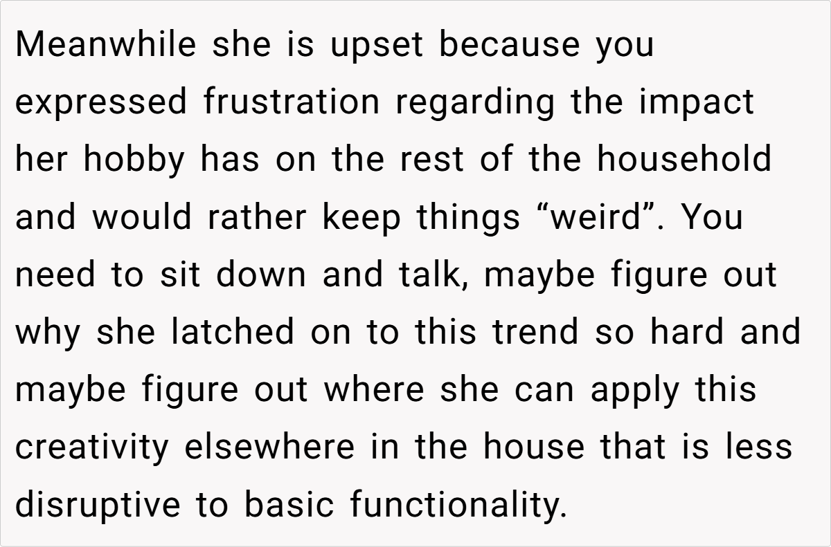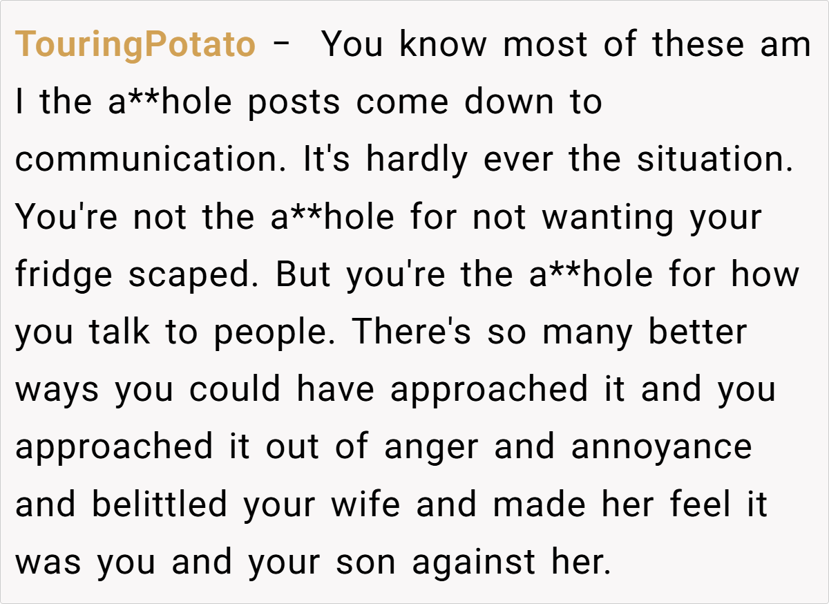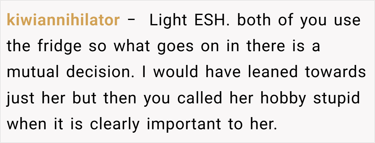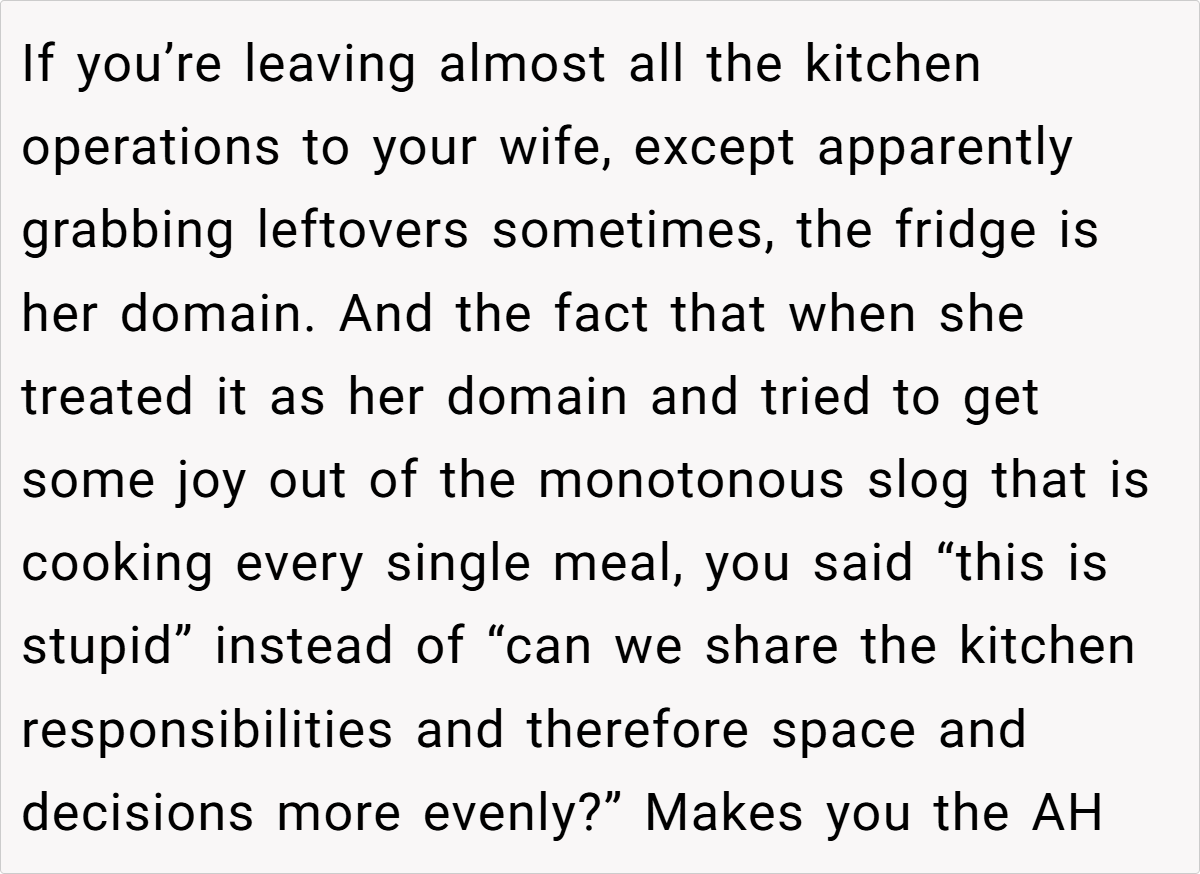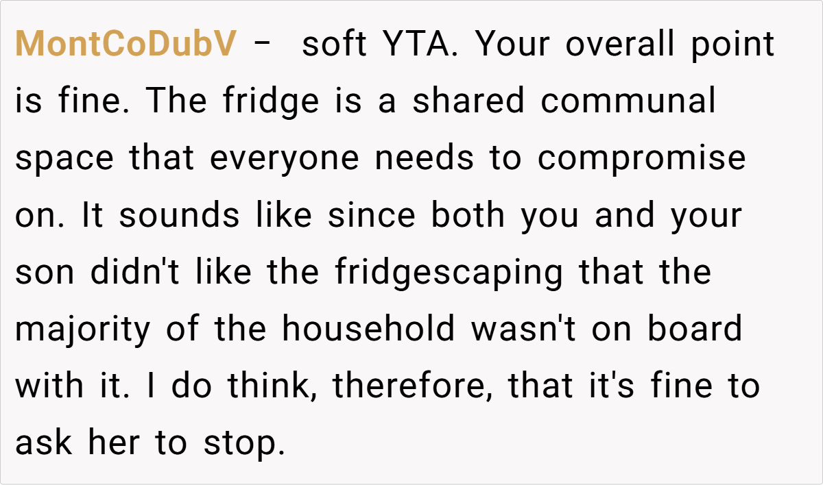 The community’s responses ranged from light-hearted critiques to more pointed advice, with many urging the husband to reconsider his choice of words and embrace a more empathetic tone. While some found his frustration understandable given the practical inconveniences, others felt that dismissing his wife’s creative outlet was a bit harsh. These diverse opinions highlight that, ultimately, the issue isn’t just about a decorated fridge—it’s about finding common ground in a shared living space.
