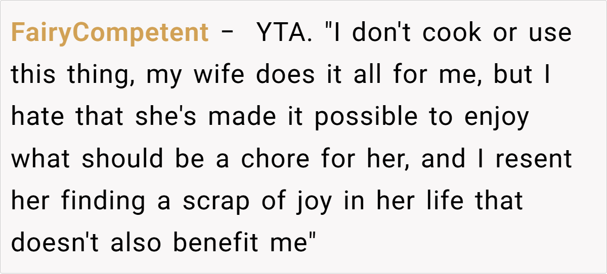 While one partner celebrates creative expression, the other longs for the simplicity of a well-used appliance. The tension isn’t just about aesthetics; it reflects deeper issues of compromise and communication in shared spaces. With emotions running high and a household divided between practicality and art, this modern domestic dilemma invites us to reflect on how personal interests can inadvertently stir up marital discord.