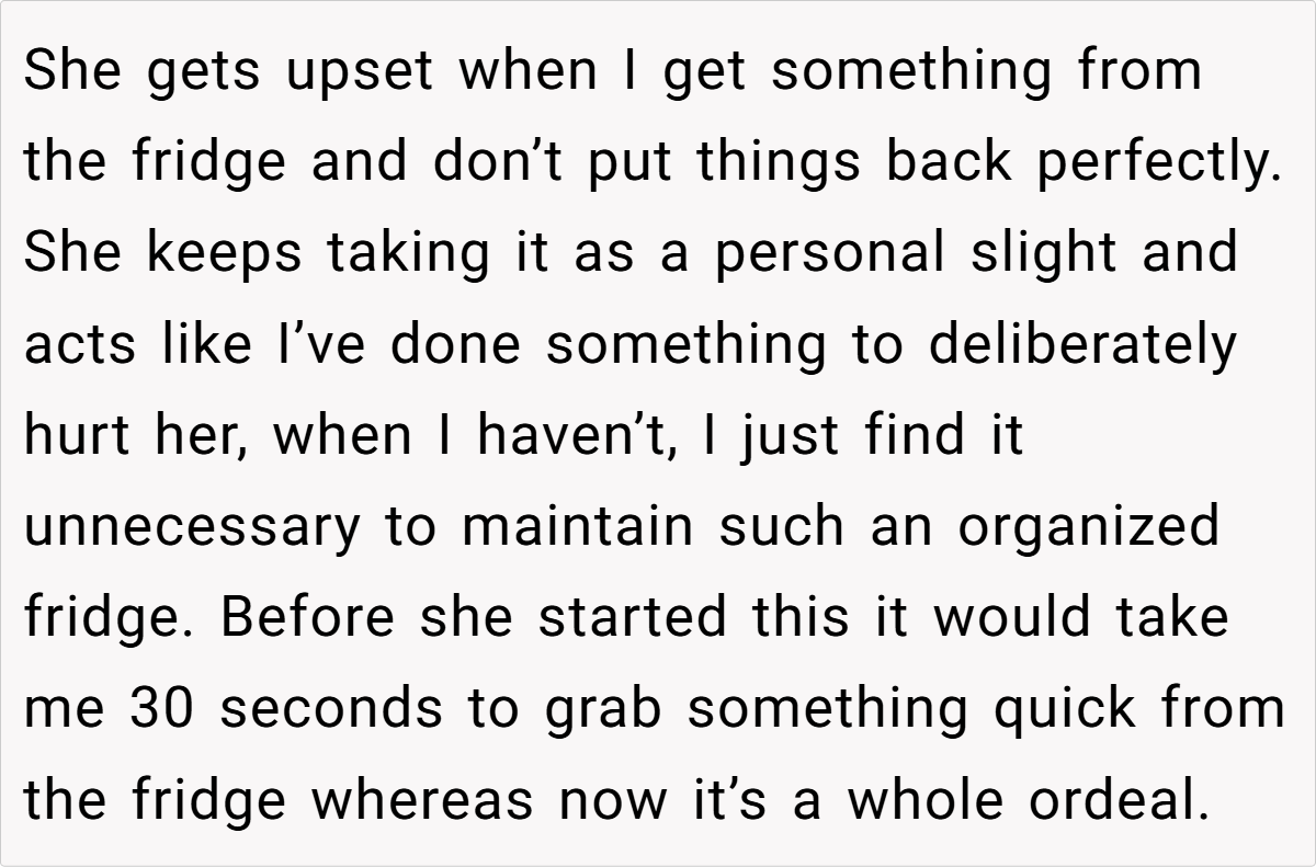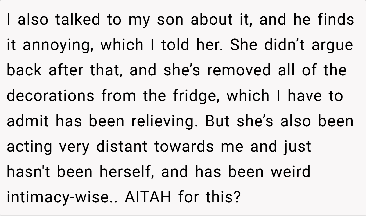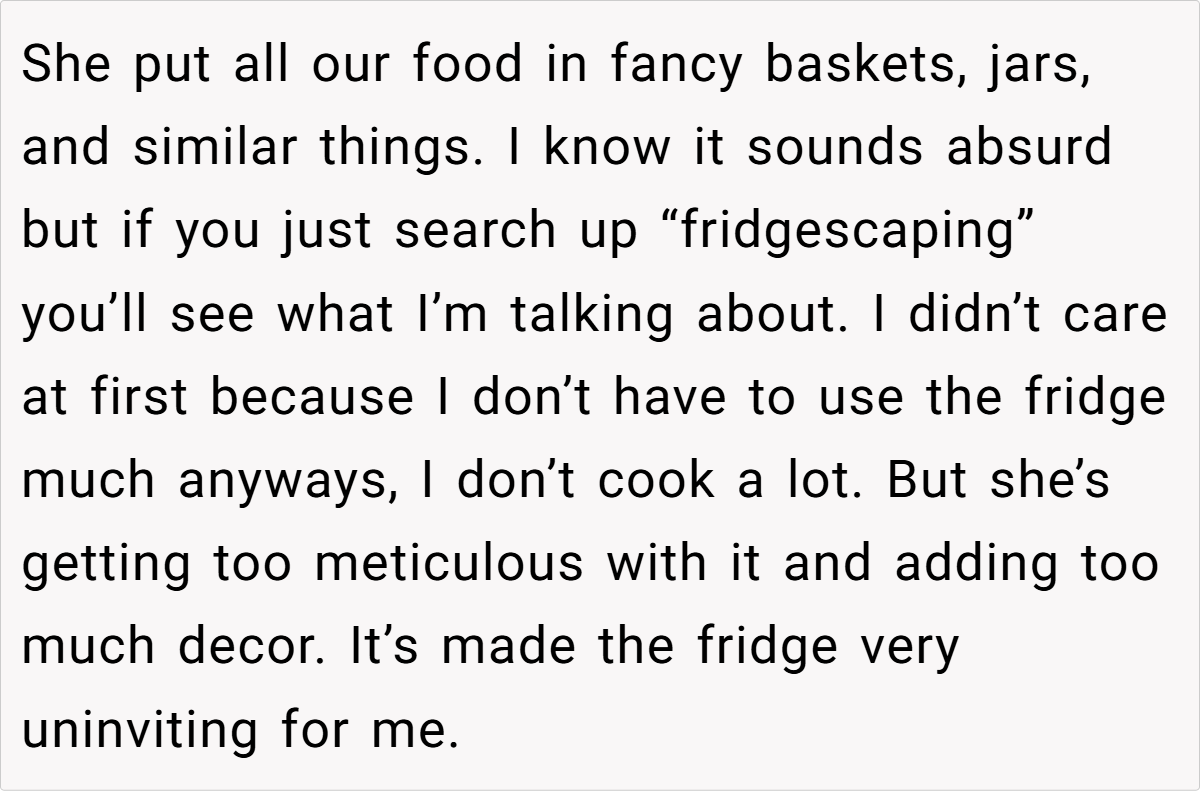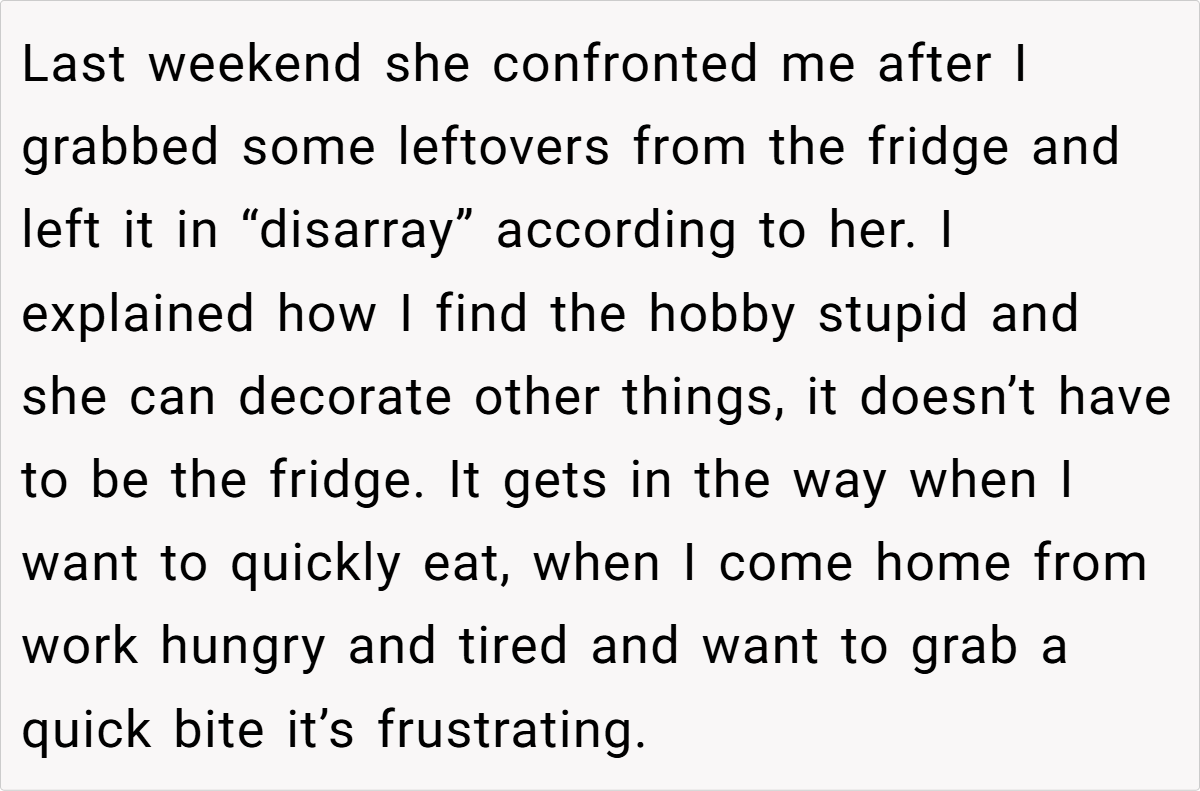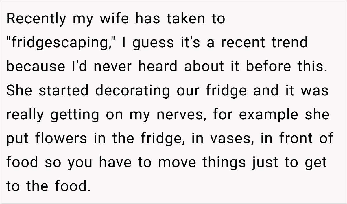 When personal quirks begin to clash with everyday functionality, it’s no wonder that tensions can boil over. The conflict in this case isn’t solely about fridge aesthetics—it’s about the balance between individual expression and the practical needs of a shared home space. The husband’s frustration, though seemingly trivial, highlights an underlying issue: how do we maintain harmony when creativity disrupts routine? This situation reminds us that compromise is key in any household.