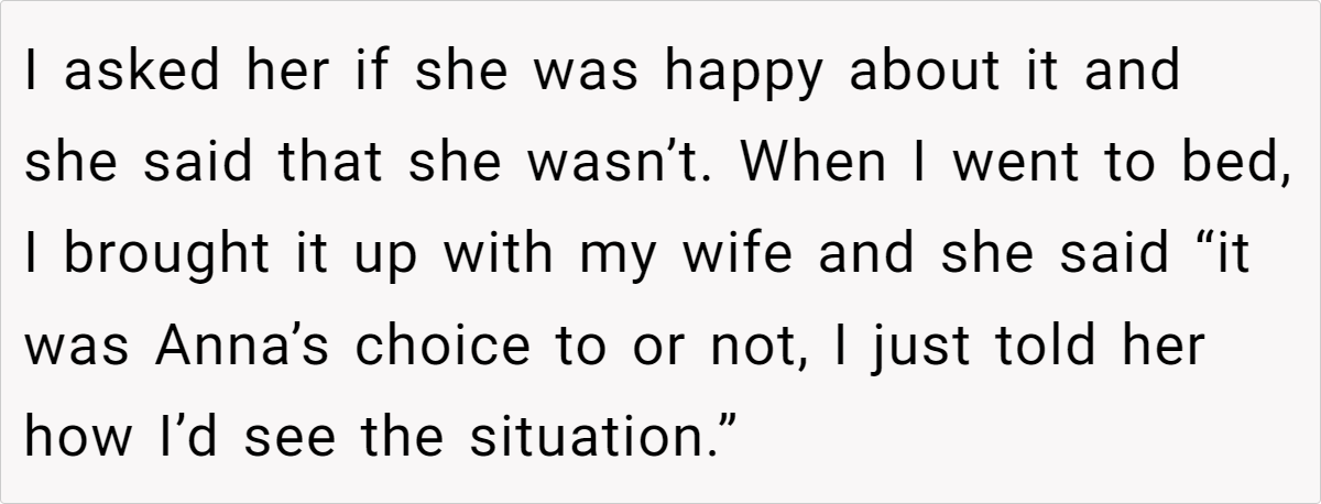 This situation invites readers to reflect on the boundaries of support within families. How should one balance the desire to show solidarity with the need to respect personal choices? Would you have acted similarly in Anna’s position, or handled the situation differently as a parent? Your perspectives and experiences can shed light on navigating such complex emotional landscapes.