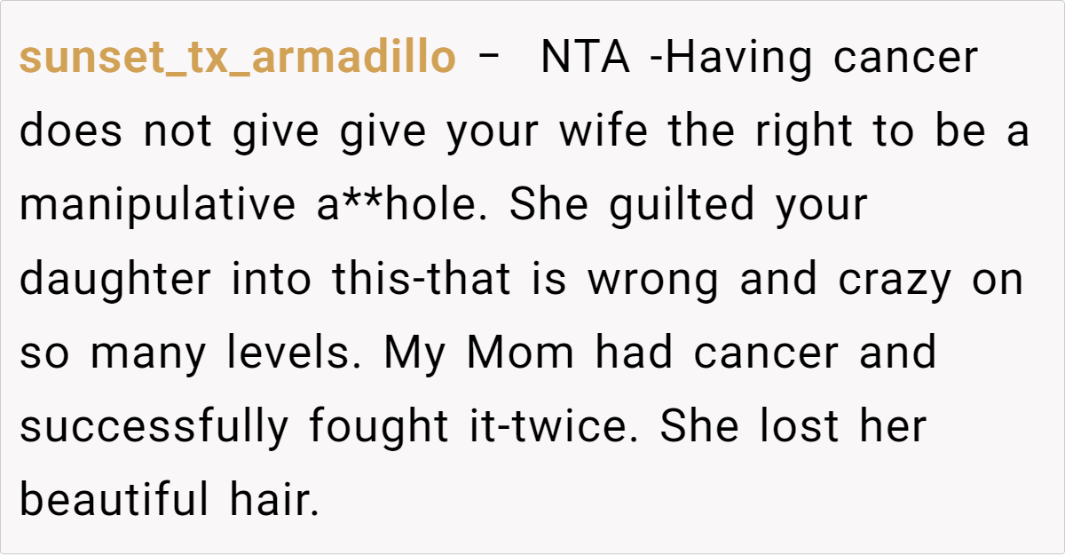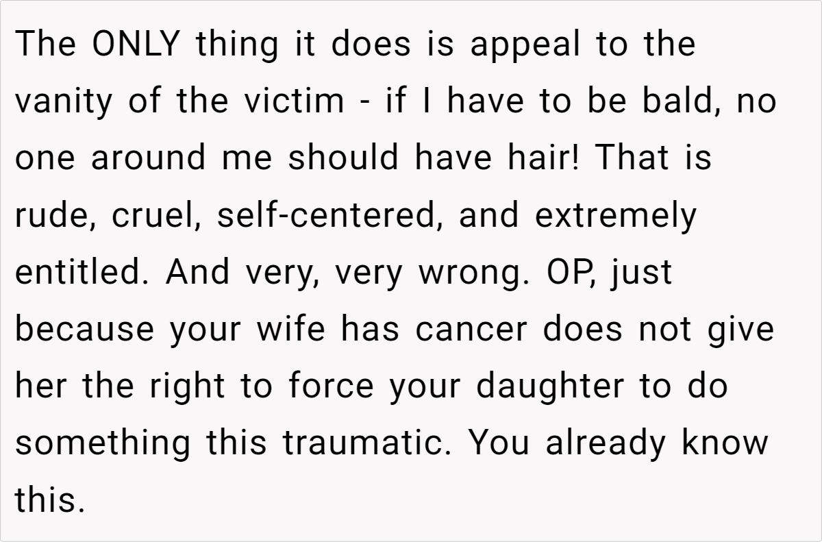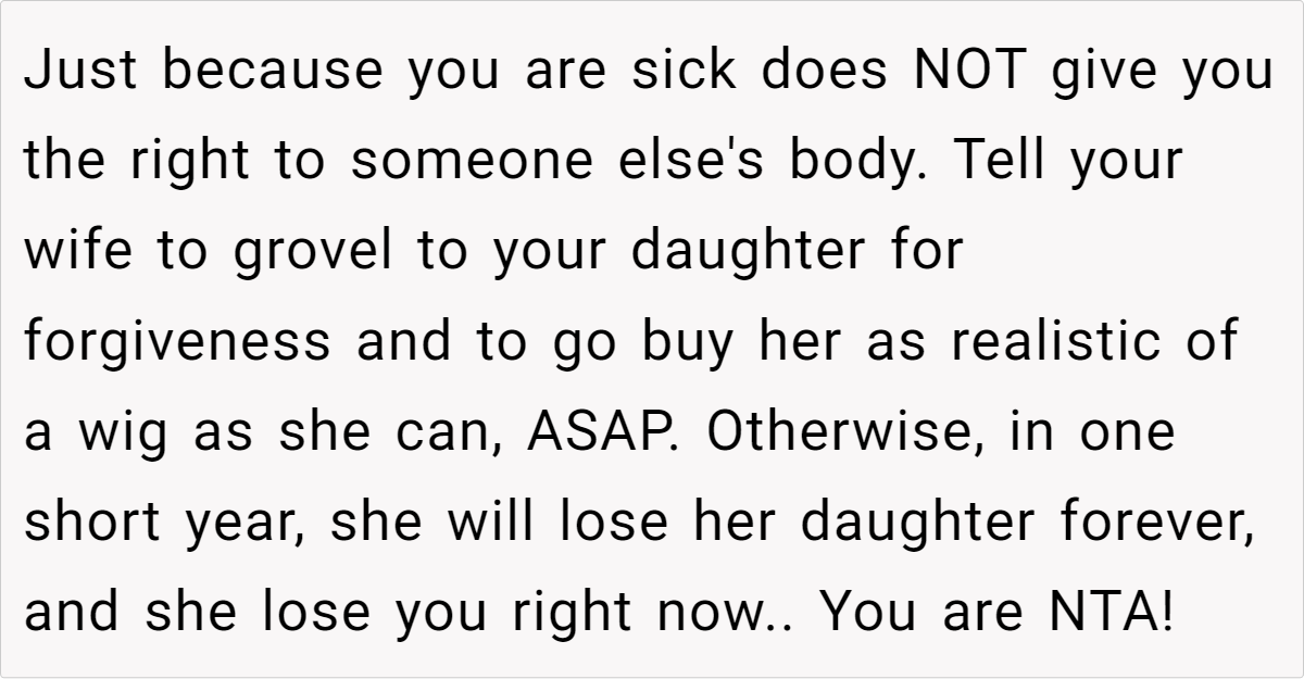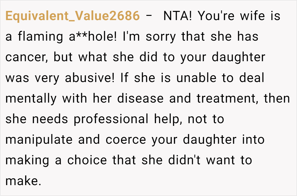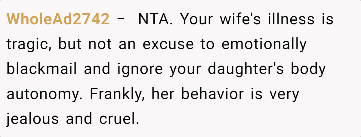 The Reddit community largely condemned the mother’s actions, labeling them as manipulative and abusive. Many users emphasized the importance of bodily autonomy and criticized the mother for emotionally coercing her daughter. Some suggested that the father consider counseling for the family to address these dynamics and support the daughter’s emotional health.