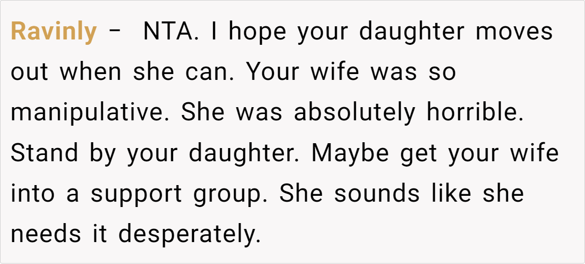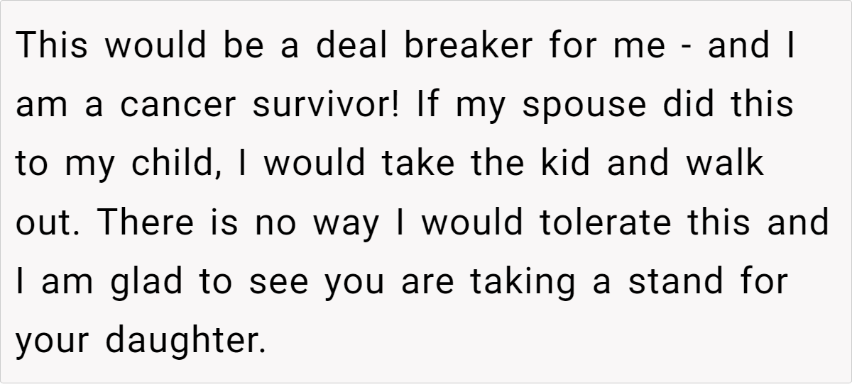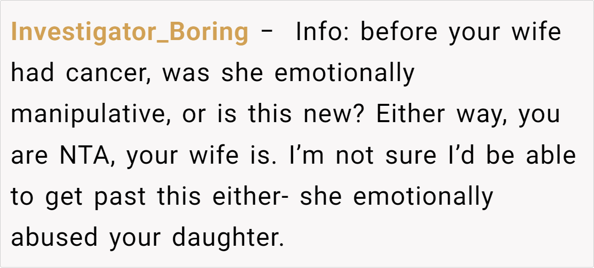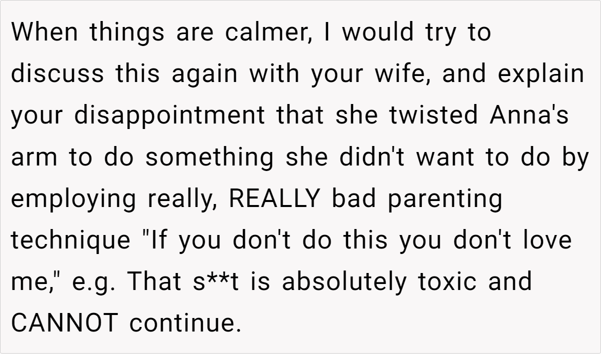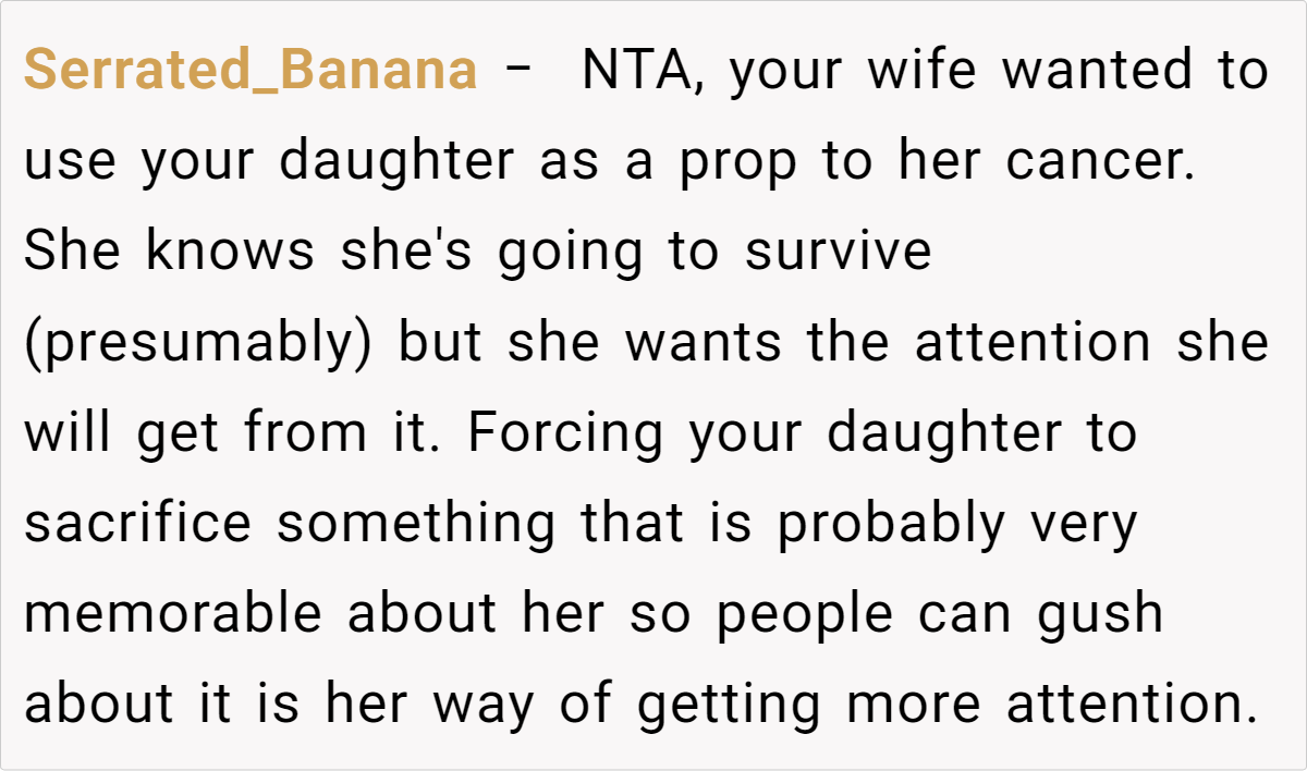 The Reddit community largely condemned the mother’s actions, labeling them as manipulative and abusive. Many users emphasized the importance of bodily autonomy and criticized the mother for emotionally coercing her daughter. Some suggested that the father consider counseling for the family to address these dynamics and support the daughter’s emotional health.